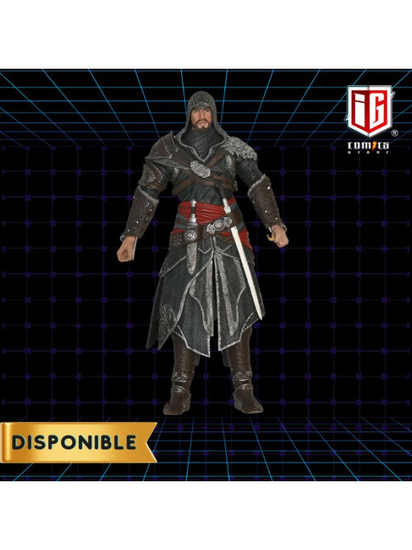 Con una articulación mejorada y pintura actualizada, Ezio Auditore tiene una escala de 7" y más de 35 puntos de articulación. Viene con manos intercambiables, daga, espada y ballesta junto con sus características cuchillas extensibles en las muñecas.