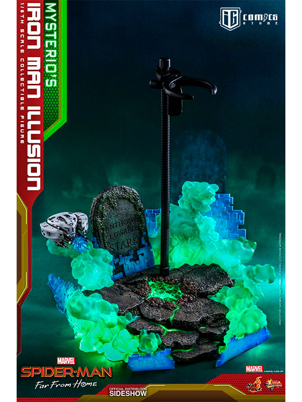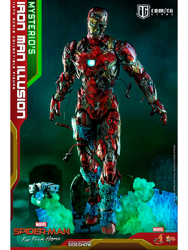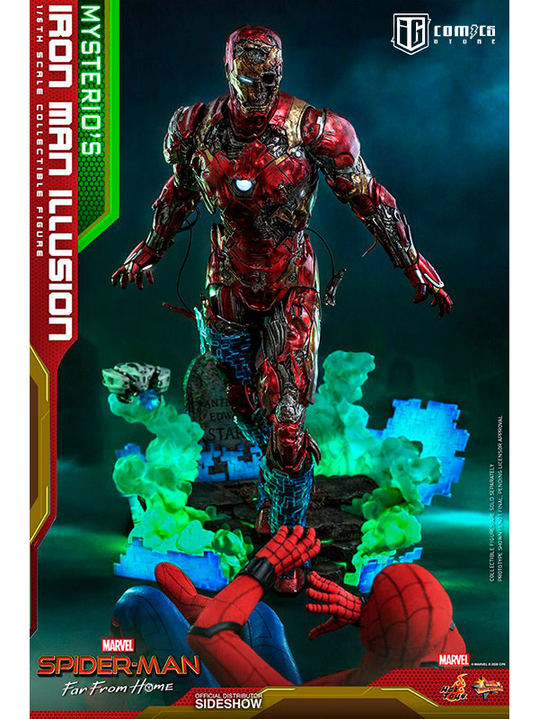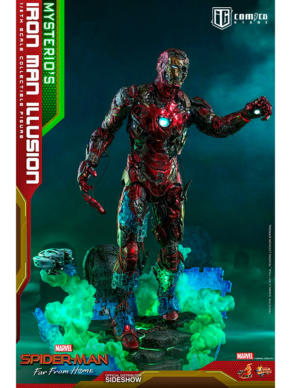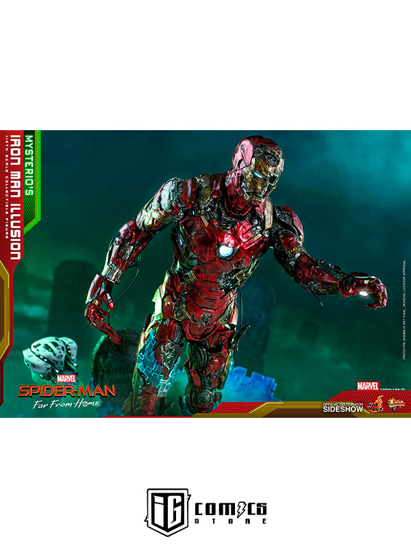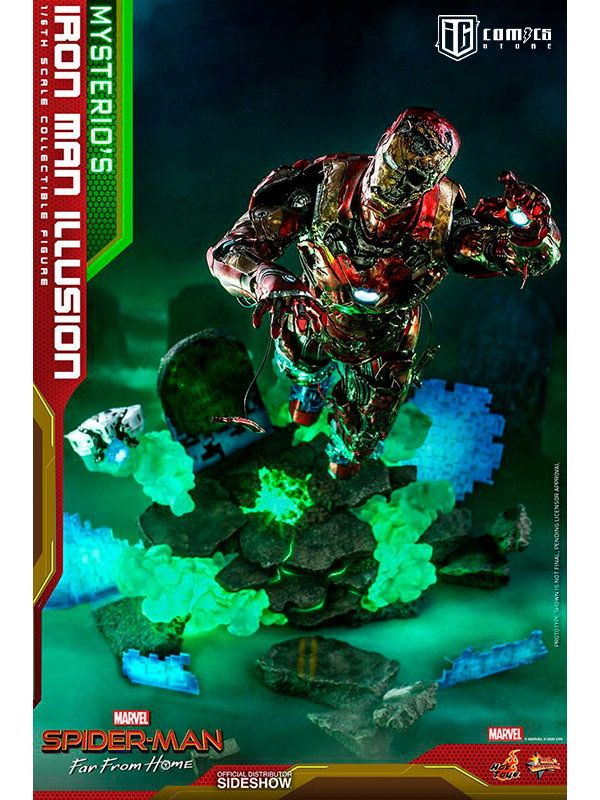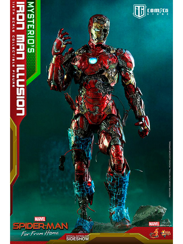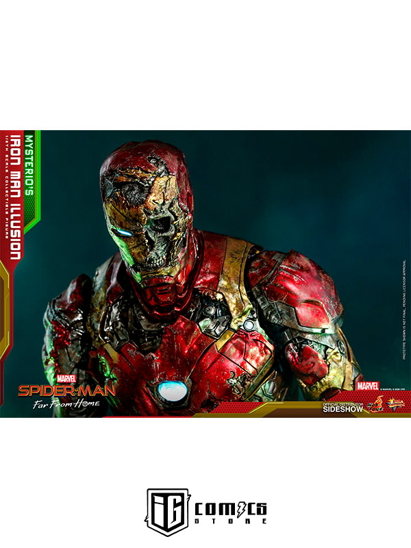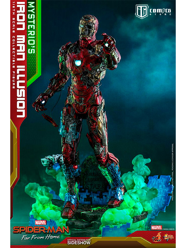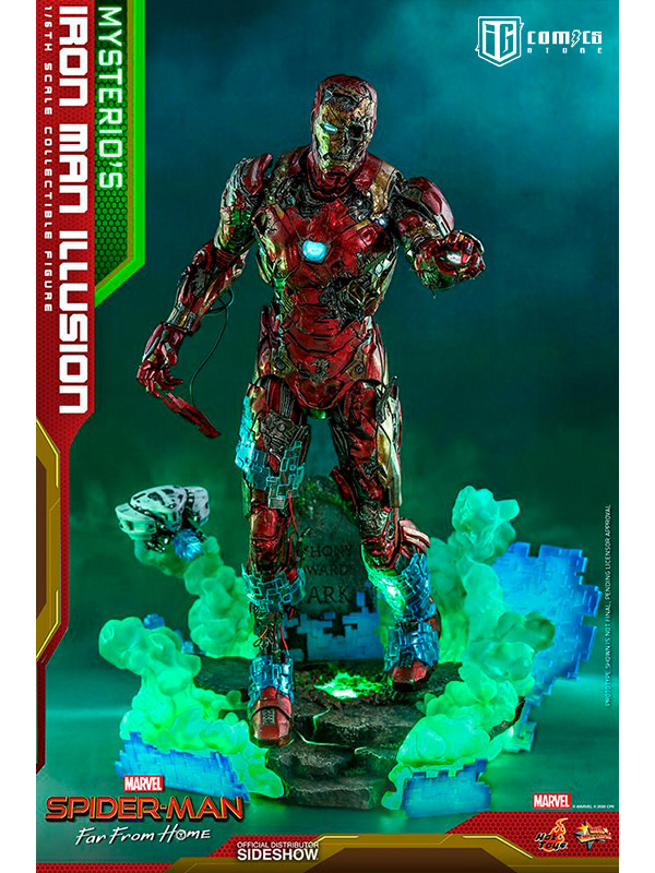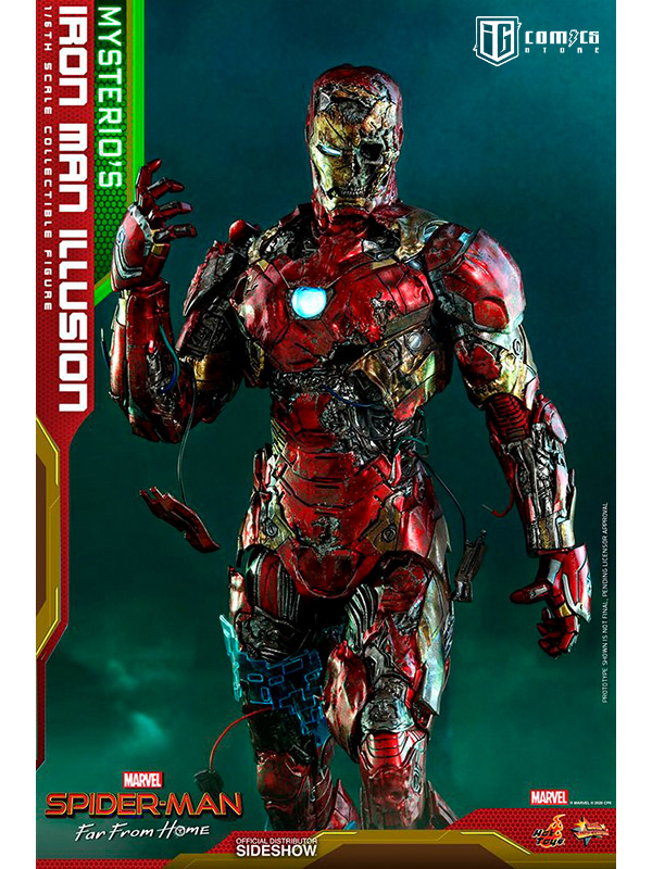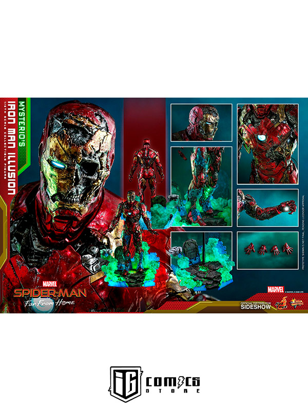 La increíble figura detallada está diseñada en base a la Ilusión de Iron Man de Mysterio en la película, presenta un efecto muy resistente a la intemperie con arañazos y óxido; armadura corroída de color rojo metálico, dorado y plateado expertamente pintada en general; una cabeza con casco recientemente dañada severamente desarrollada con función de iluminación LED, que revela el cráneo parcial a la izquierda; cables expuestos unidos a la armadura destrozada de Iron Man revelando finos detalles mecánicos; Funciones de iluminación LED en Arc Reactor en el pecho y las manos. Por último, pero no menos importante, una base de figura de diorama altamente elaborada inspirada en la lucha de alucinaciones con diseño de función de iluminación LED; viene con un droide y efectos de humo verde; y accesorios de efectos pixelados para completar la notable configuración visual.