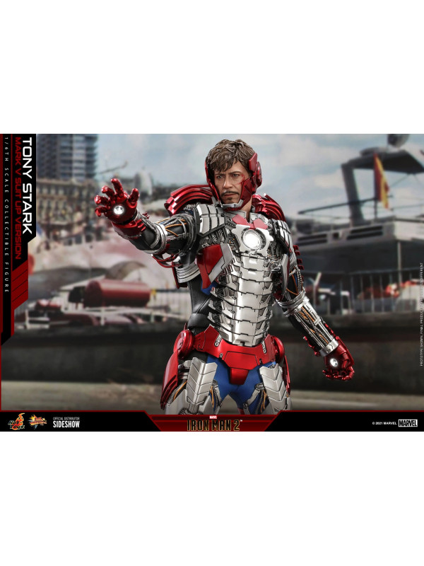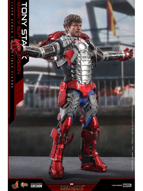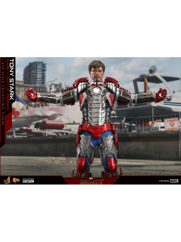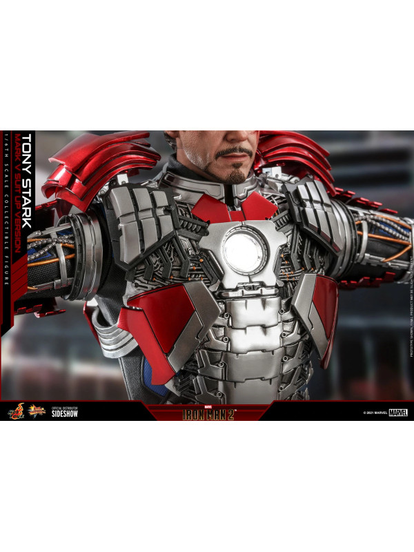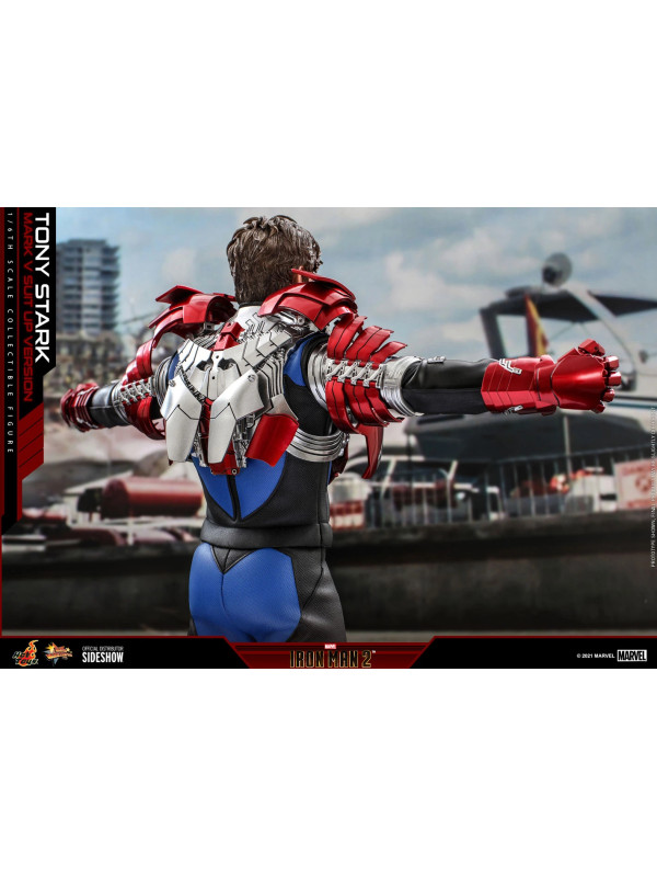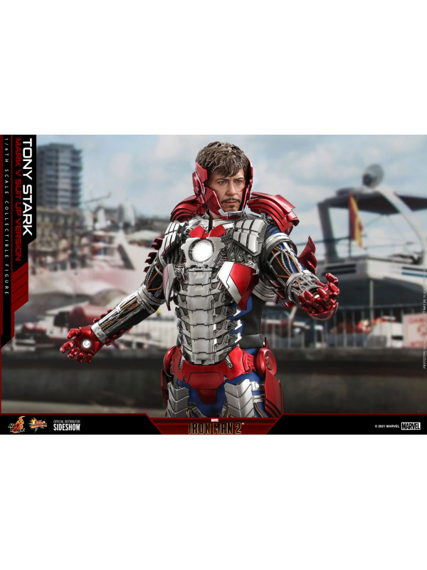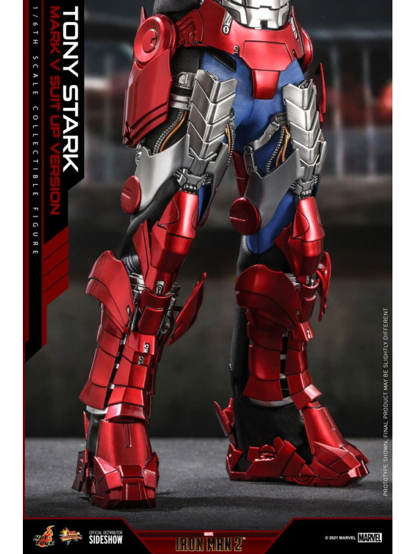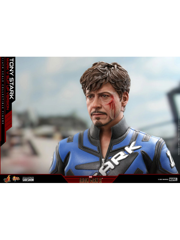 Inspirados en la escena del Mark V en la pista de carreras en Iron Man 2, Sideshow y Hot Toys presentan la figura coleccionable a escala sexta escala de Tony Stark (Mark V Suit up Version). Demuestra piezas de armadura perfectamente diseñadas con detalles mecánicos y función articulada, lo que permite a los fanáticos ensamblar la impresionante armadura en la parte superior de la figura altamente detallada.