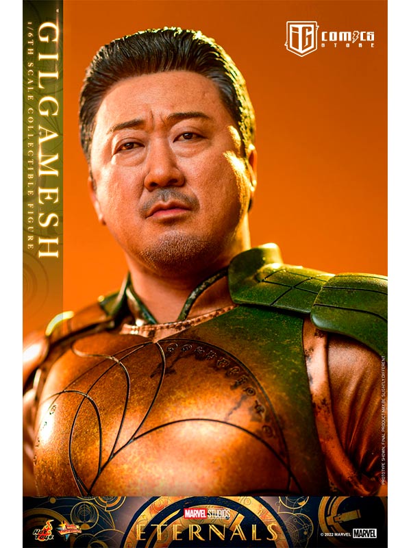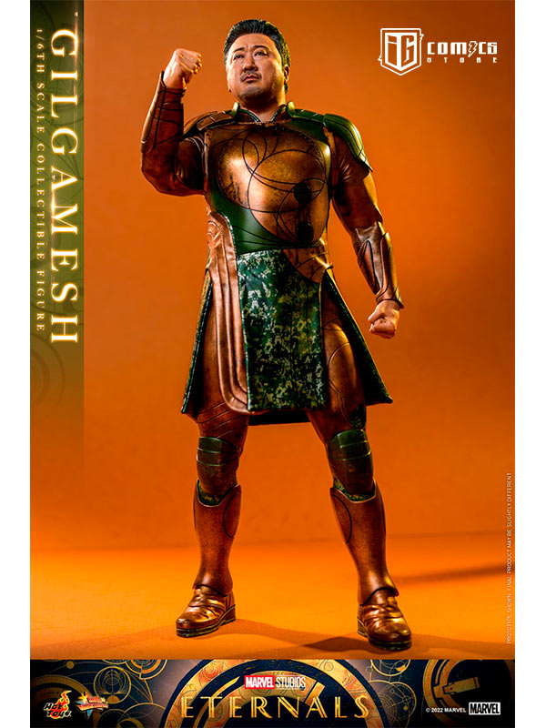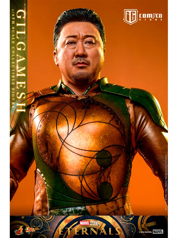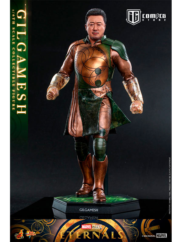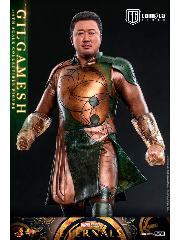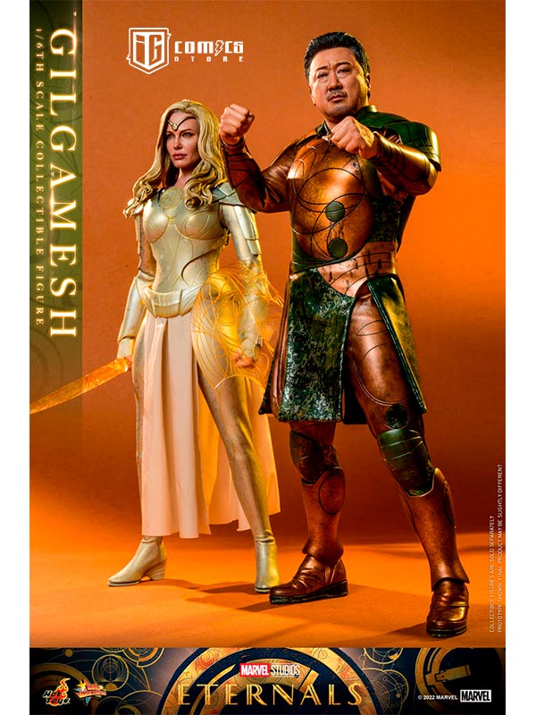 Hábilmente diseñada en base a la aparición en pantalla de Don Lee como Gilgamesh en Eternals , la figura presenta una escultura de cabeza y cabello rubio recientemente desarrollada con una semejanza asombrosa, una figura tonificada que retrata naturalmente el cuerpo musculoso de Gilgamesh, un traje de batalla finamente confeccionado y armaduras estampadas en bronce y color verde con detalles metálicos, un par de guantes y puños de color translúcido con patrones geométricos dorados que acentúan su habilidad única, y una figura de pie.