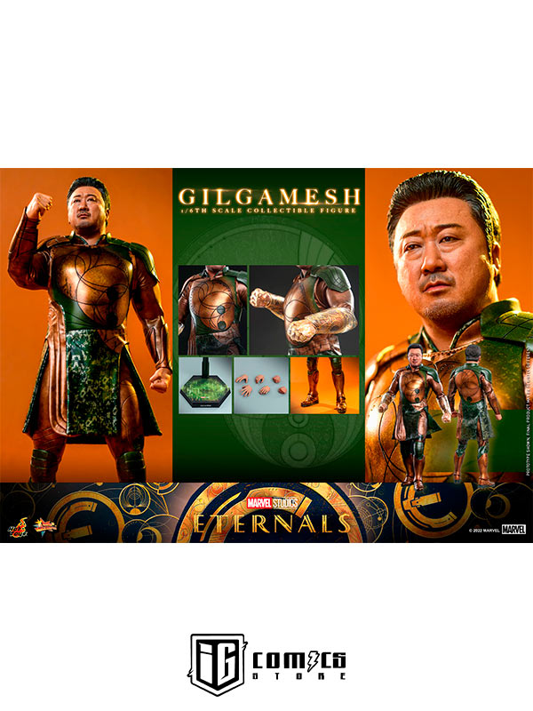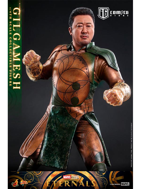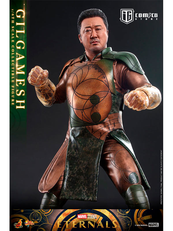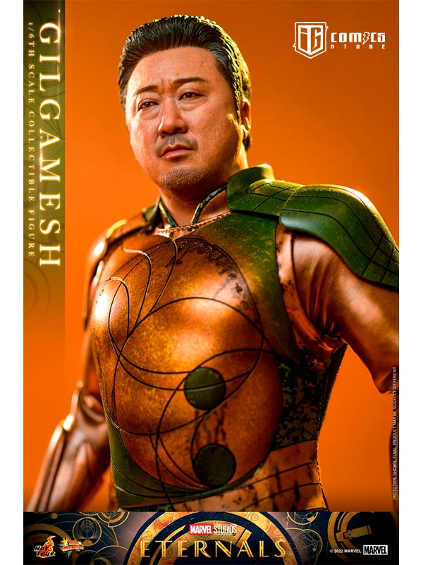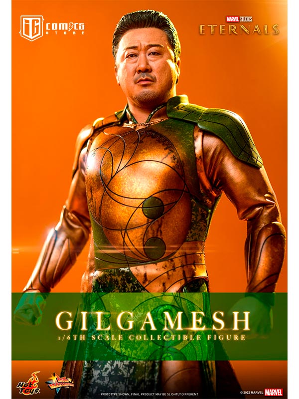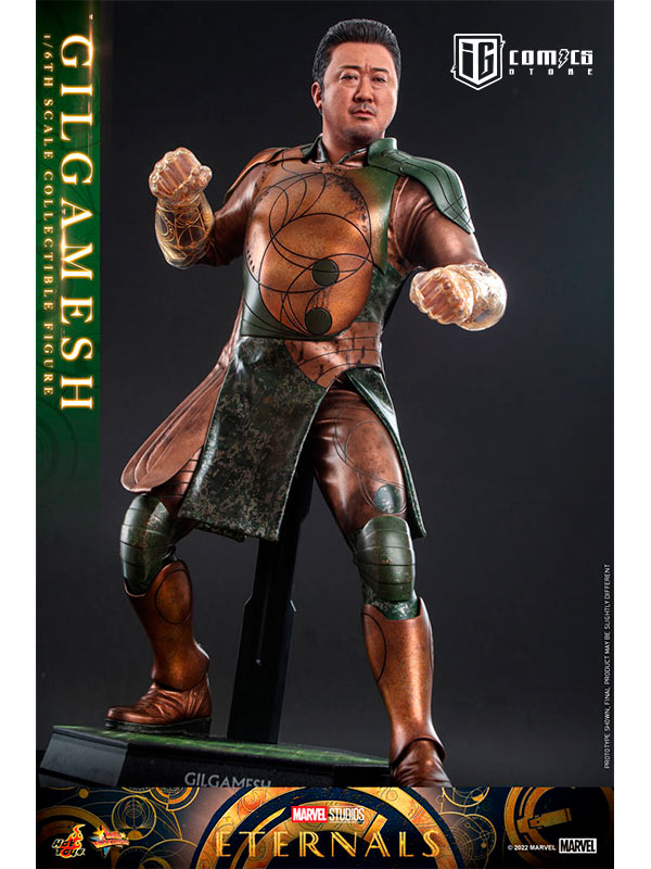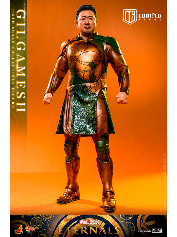 Hábilmente diseñada en base a la aparición en pantalla de Don Lee como Gilgamesh en Eternals , la figura presenta una escultura de cabeza y cabello rubio recientemente desarrollada con una semejanza asombrosa, una figura tonificada que retrata naturalmente el cuerpo musculoso de Gilgamesh, un traje de batalla finamente confeccionado y armaduras estampadas en bronce y color verde con detalles metálicos, un par de guantes y puños de color translúcido con patrones geométricos dorados que acentúan su habilidad única, y una figura de pie.