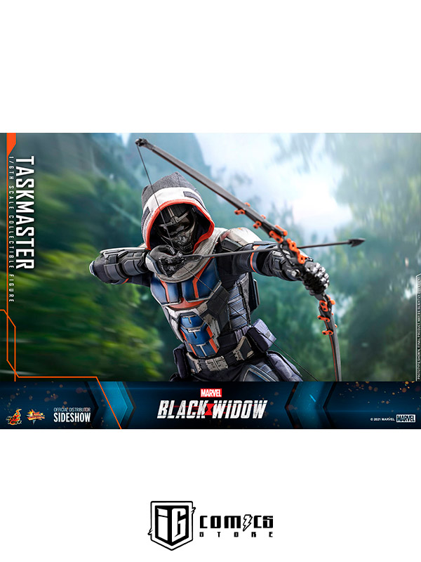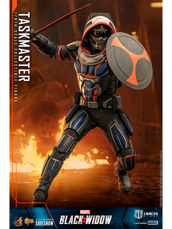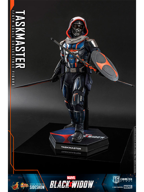 La figura altamente articulada está diseñada por expertos basándose en la imagen de Taskmaster en Black Widow. Las características incluyen el casco y las piezas de armadura de nuevo diseño, un atuendo de alta tecnología finamente diseñado en un esquema de color azul marino y naranja característico, una variedad de armas detalladas que incluyen arco y flechas, escudo circular, espada y un soporte de figura temático.