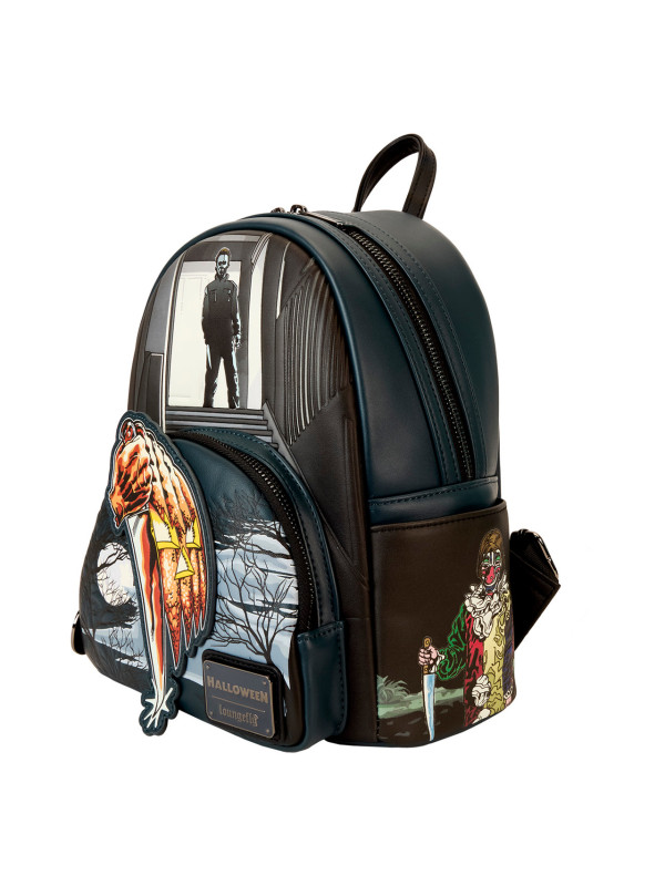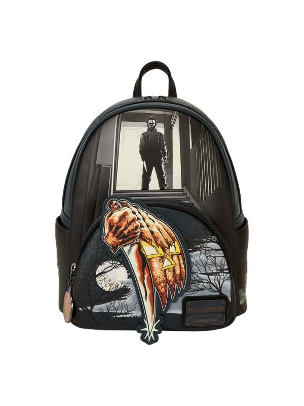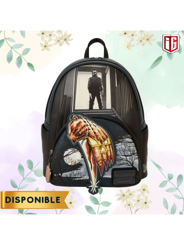 parte inferior de la mochila. Arriba, Michael Myers está de pie en lo alto de