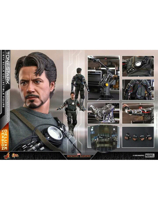 Diseñada magistralmente a partir de la imagen de Robert Downey Jr. como Tony Stark en Iron Man , la figura incluye una cabeza esculpida con un parecido increíble, luces LED en el reactor de arco del pecho, palmas repulsoras y piernas, guanteletes y armadura de piernas con pintura metálica que muestran un diseño mecánico complejo, cables mecánicos que se extienden alrededor de la parte superior del cuerpo, al igual que en la película, y un atuendo informal de fina confección. Junto con la figura, se incluye una base dinámica en forma de diamante y un fondo a juego para recrear el taller de Tony Stark donde realizó las armaduras prototipo en una prueba de vuelo.