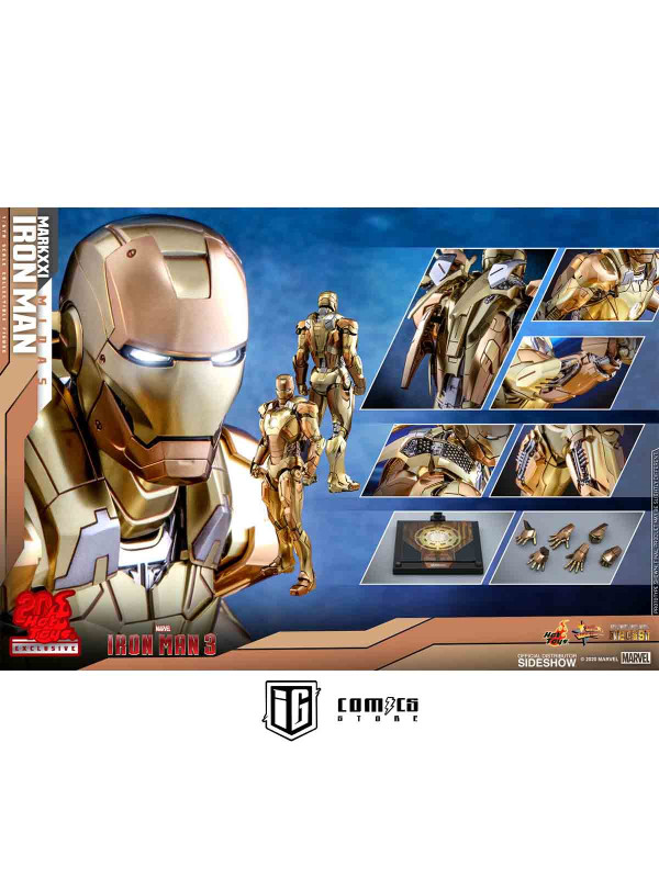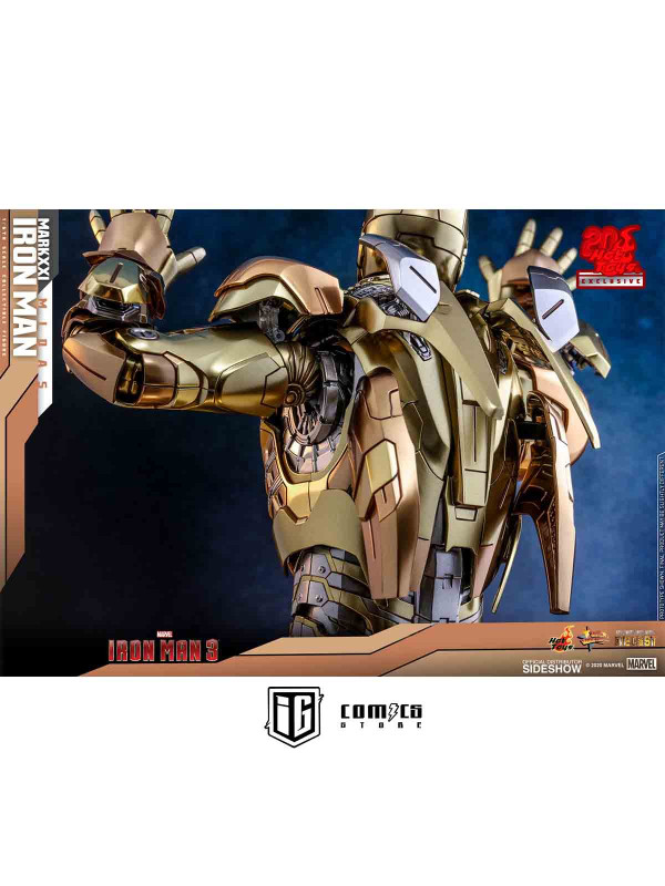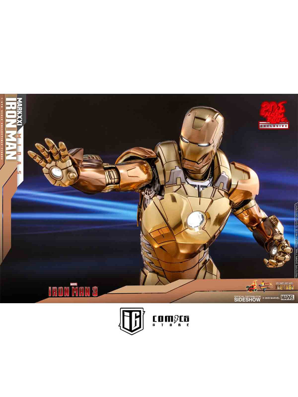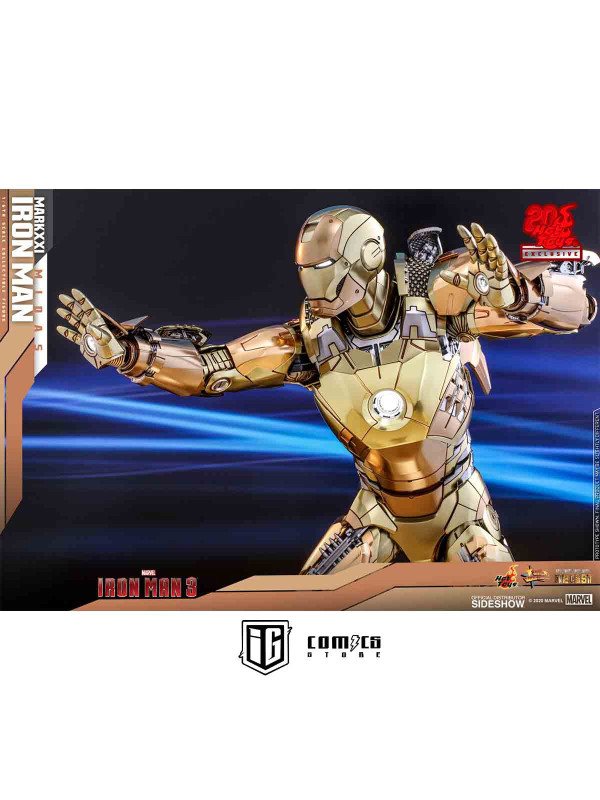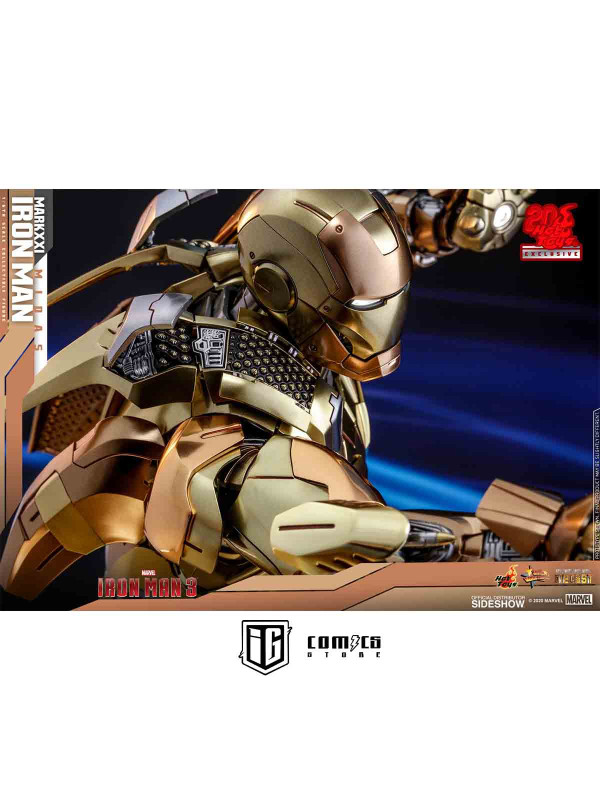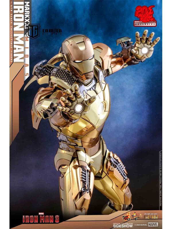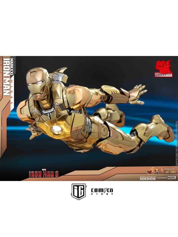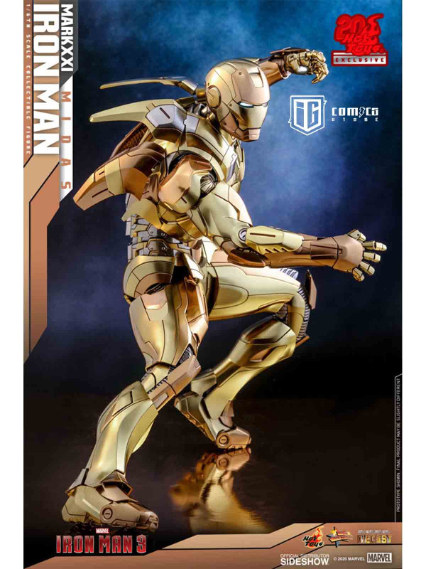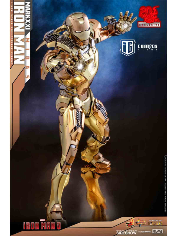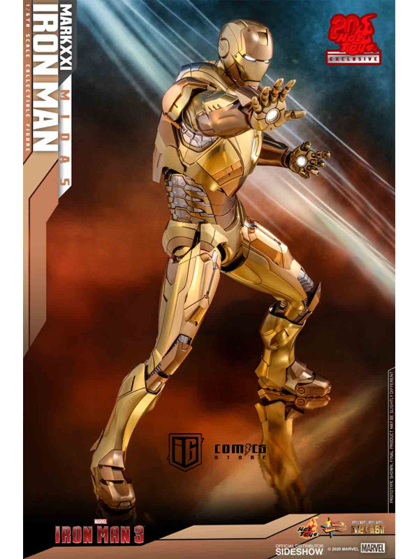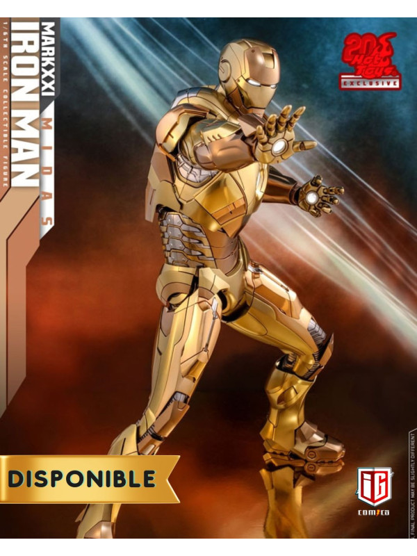 Rindiendo un gran homenaje a uno de los primeros trajes de Iron Man, Hot Toys se complace en presentar hoy la figura coleccionable a escala 1/6 de Iron Man Mark XXI (Midas) de Iron Man 3 , un artículo exclusivo de Hot Toys. Pintada en diferentes tonos de oro y plata metalizados, la detallada figura de Iron Man se ha mejorado gracias a una pintura cromada adicional que realza los detalles de la armadura.