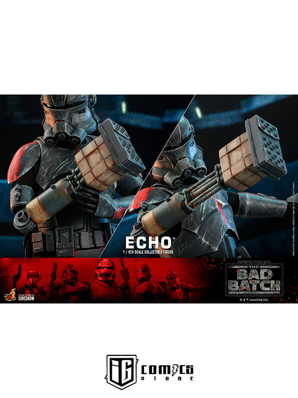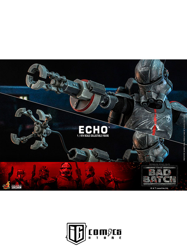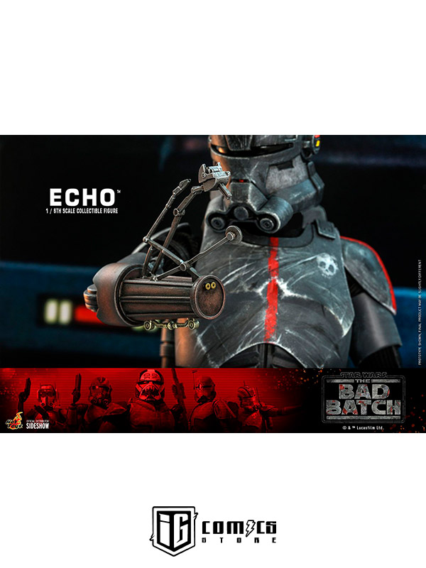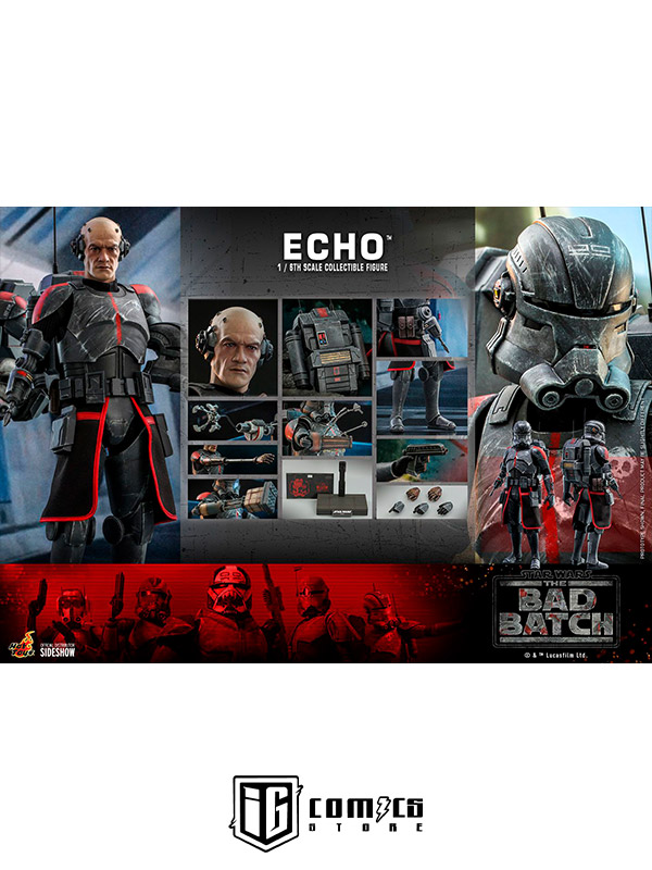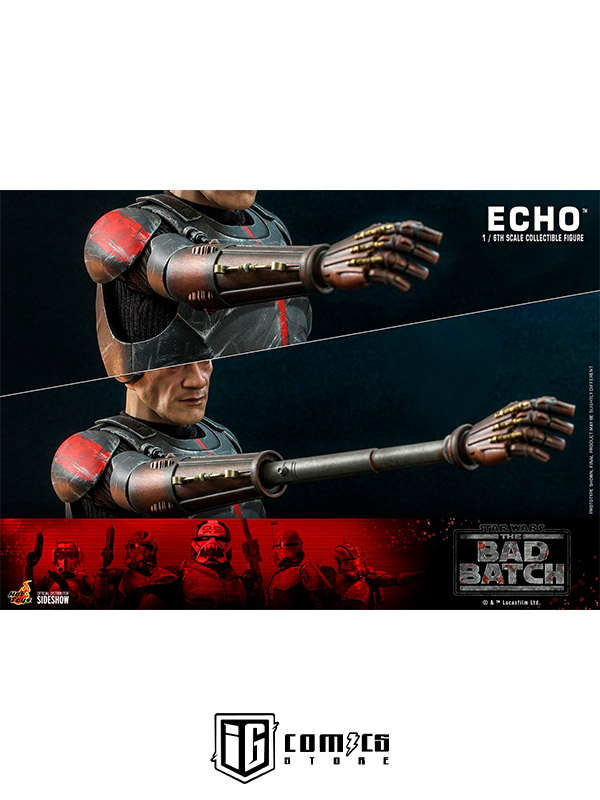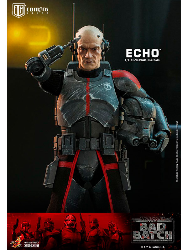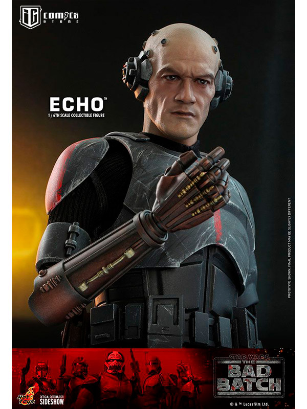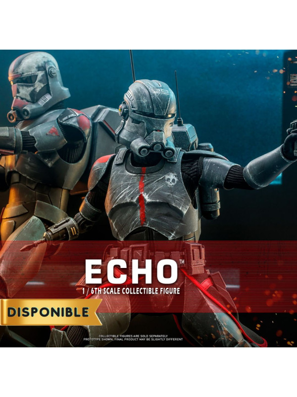 Esta figura coleccionable de gran precisión presenta una recreación hábilmente elaborada y con gran detalle de la armadura y el casco de Echo, una cabeza intercambiable con gran parecido, las partes cibernéticas únicas del personaje, incluyendo una variedad de brazos derechos mecánicos intercambiables, una mochila militar, un bláster y una base de exhibición.