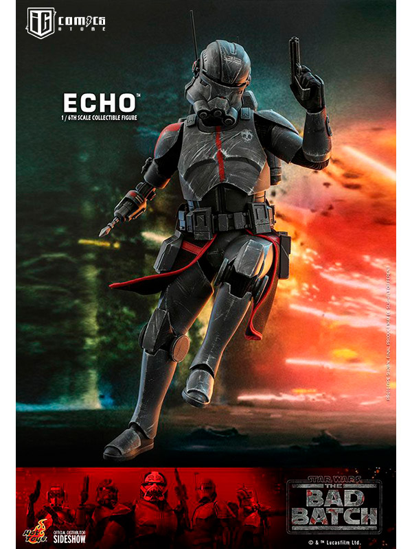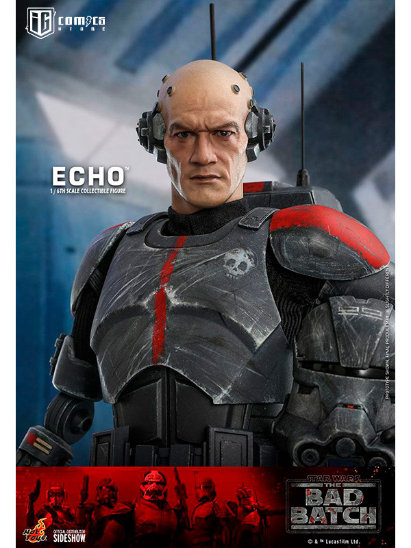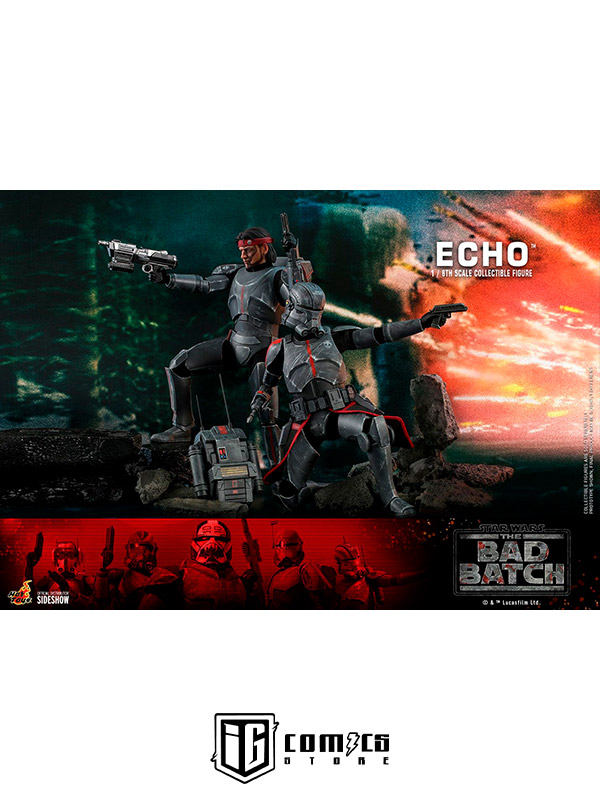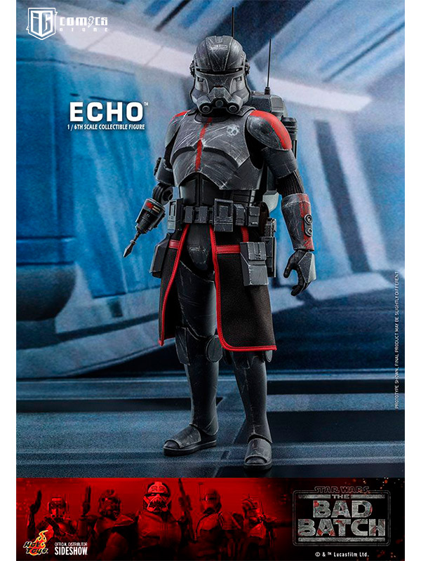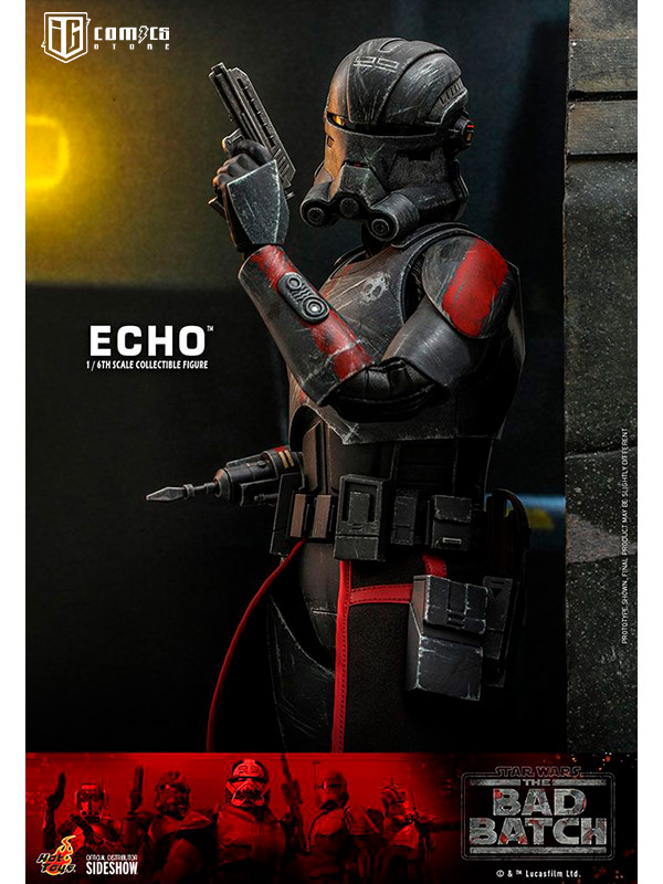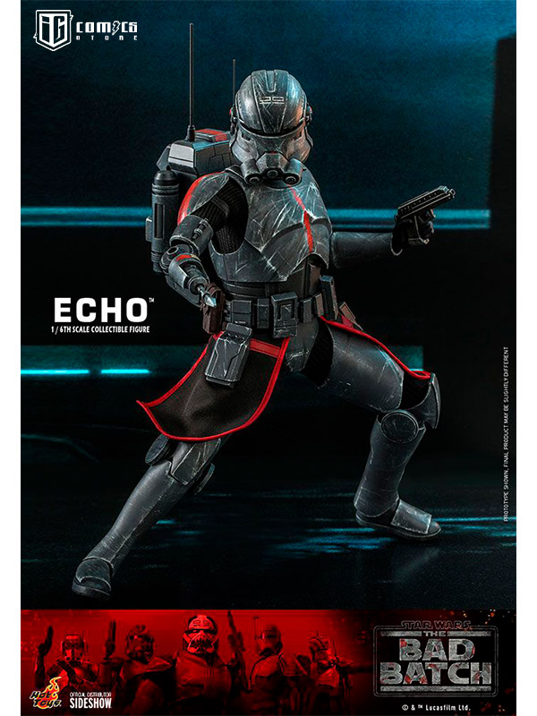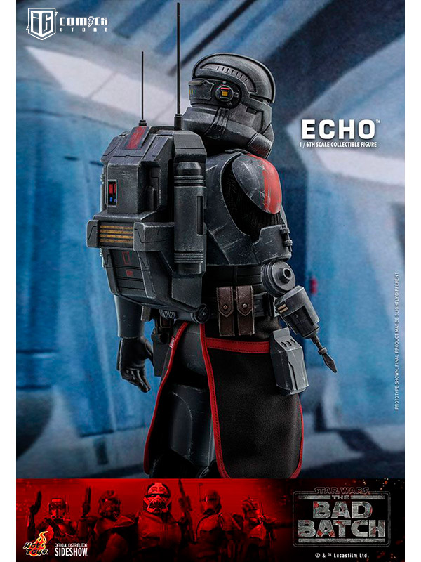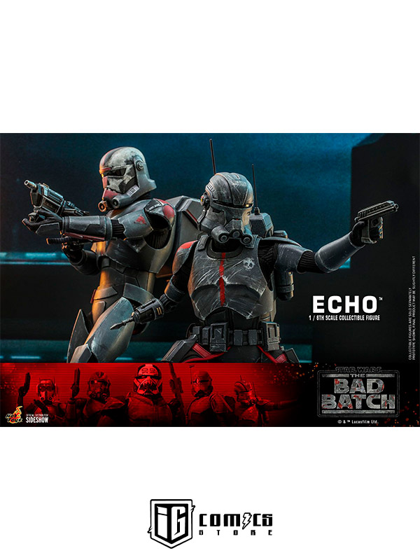 Esta figura coleccionable de gran precisión presenta una recreación hábilmente elaborada y con gran detalle de la armadura y el casco de Echo, una cabeza intercambiable con gran parecido, las partes cibernéticas únicas del personaje, incluyendo una variedad de brazos derechos mecánicos intercambiables, una mochila militar, un bláster y una base de exhibición.