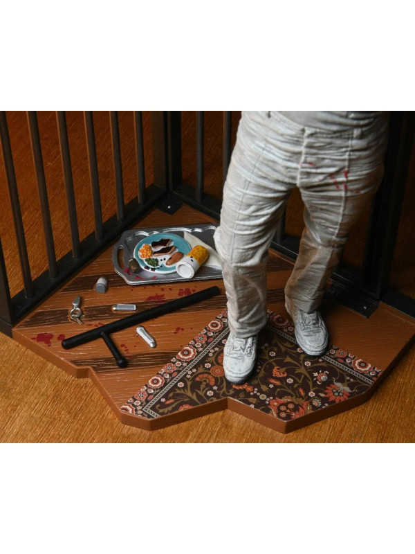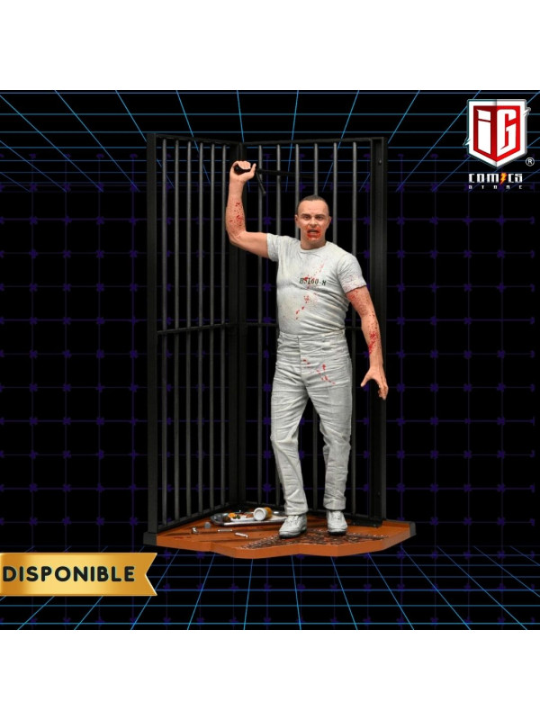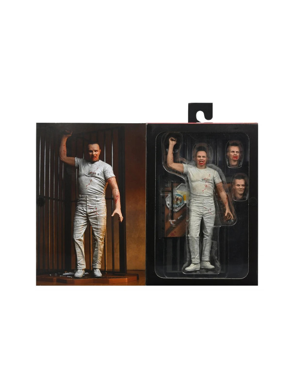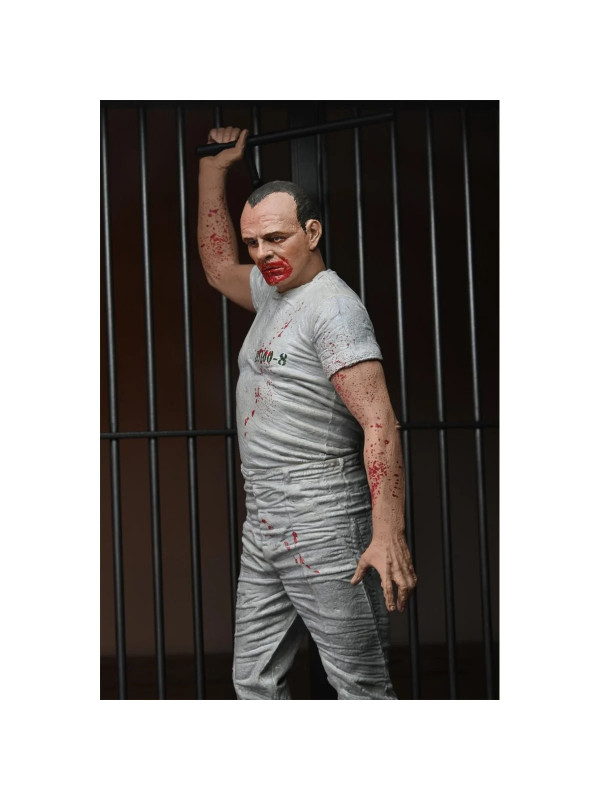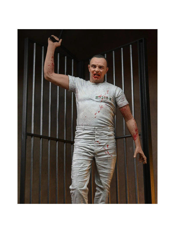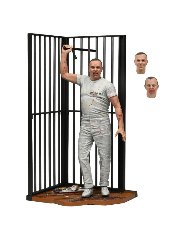 Esta escalofriante figura del Dr. Hannibal Lecter con su uniforme de prisión blanco salpicado de sangre captura el momento en que se venga asesinamente de sus captores. Interpretado por el ganador del Oscar Anthony Hopkins, el brillante y psicótico doctor cobra vida como una figura de acción a escala de 7 pulgadas con cabezas intercambiables, bastón y base de diorama de su escena de escape de la celda de prisión. ¡Viene en una caja con ventana para coleccionistas con solapa que se abre que es ideal para exhibir!