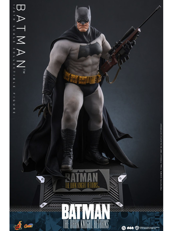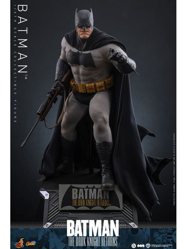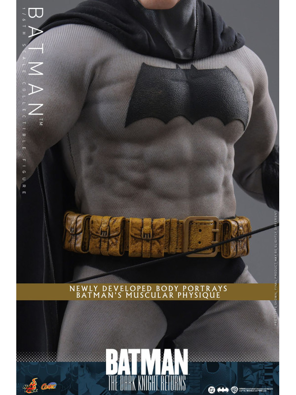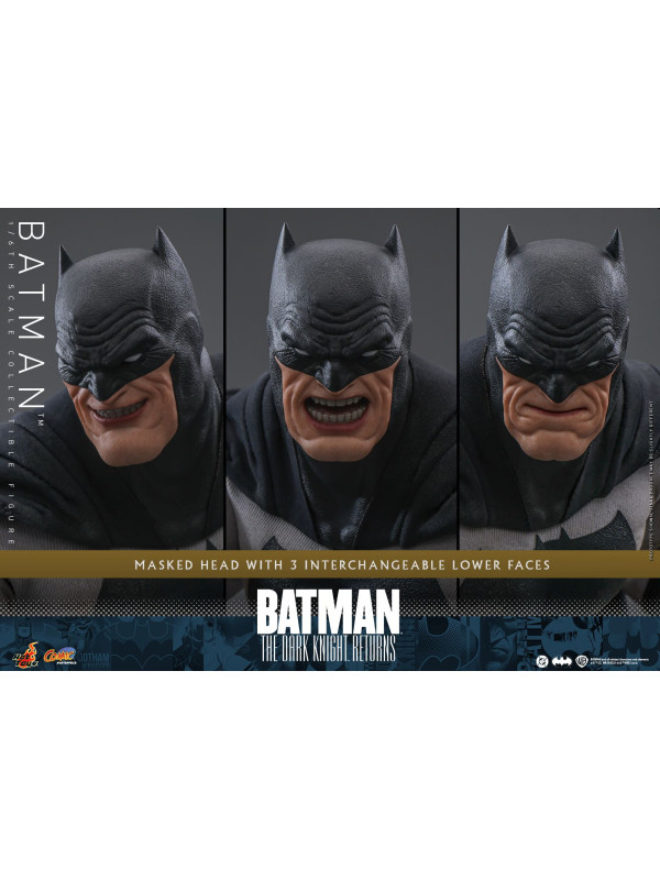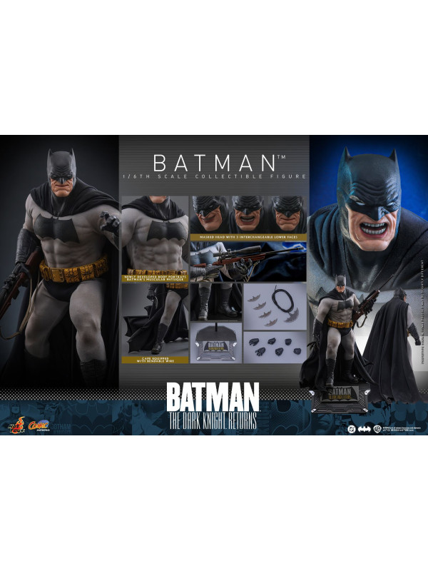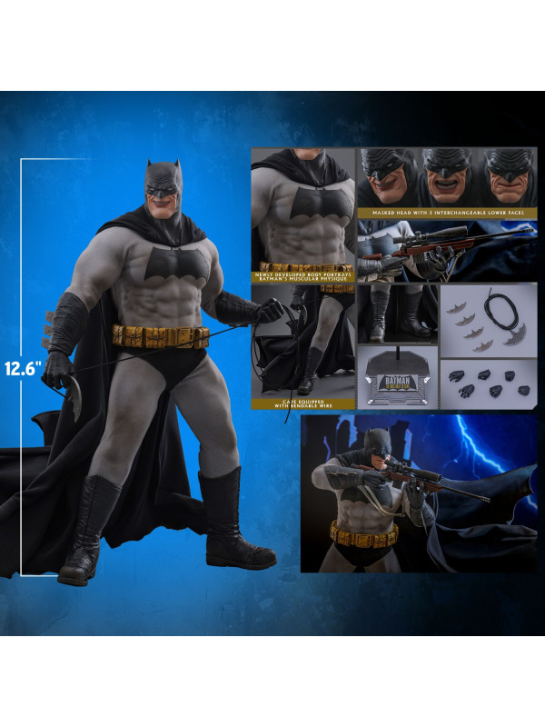 Inspirada en la aparición de Batman en "Batman: The Dark Knight Returns", esta figura de sexta escalameticulosamente elaborada presenta un cuerpo recientemente desarrollado con 30 puntos de articulación que retrata el físico musculoso de Batman y una cabeza enmascarada con partes inferiores de la cara intercambiables. La figura coleccionable también viene con un traje de Batman especialmente diseñado con un símbolo de murciélago grande y una capa con alambre adjunta, un cinturón de herramientas con efectos de desgaste, batarangs, un rifle y una base de figura especialmente diseñada con placa de identificación del personaje.