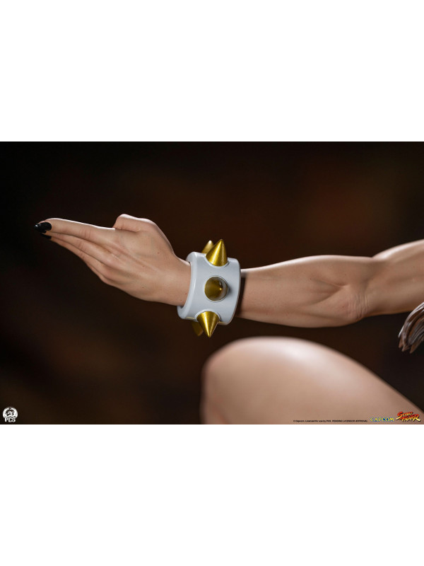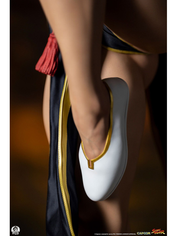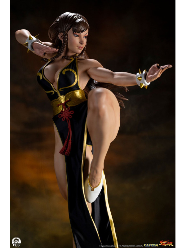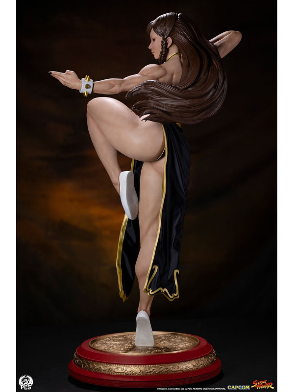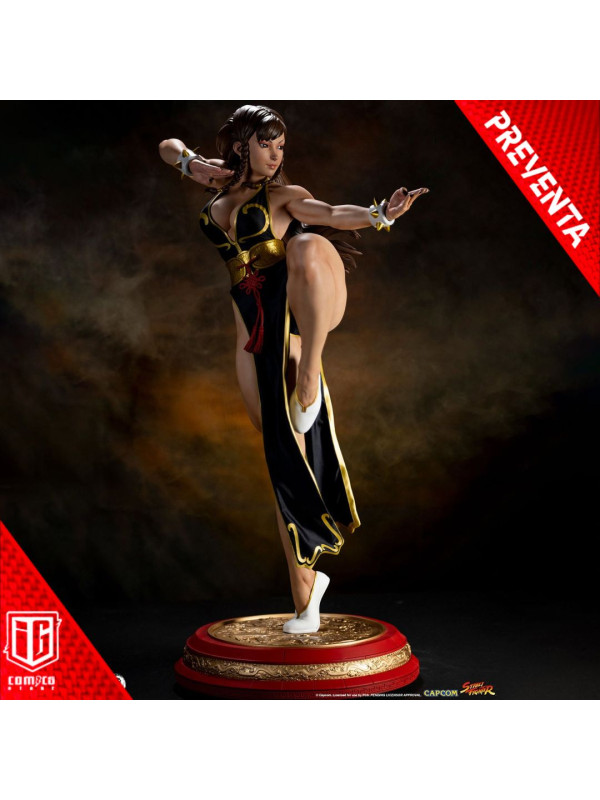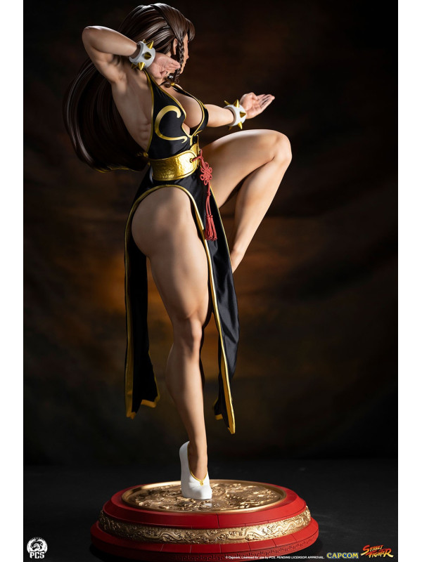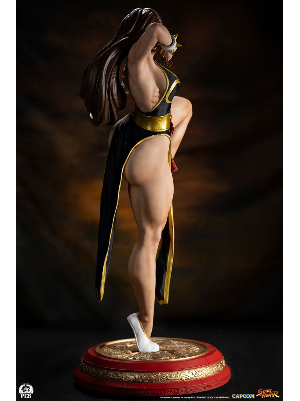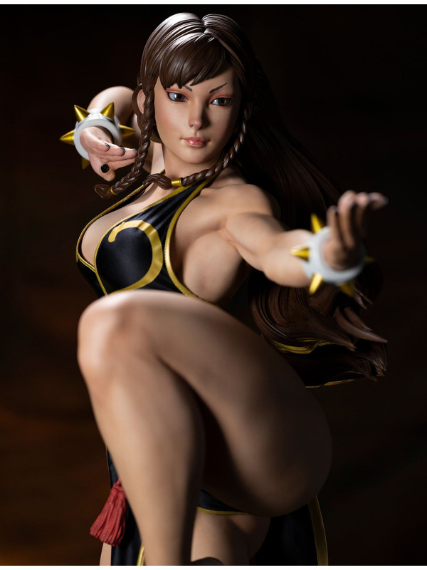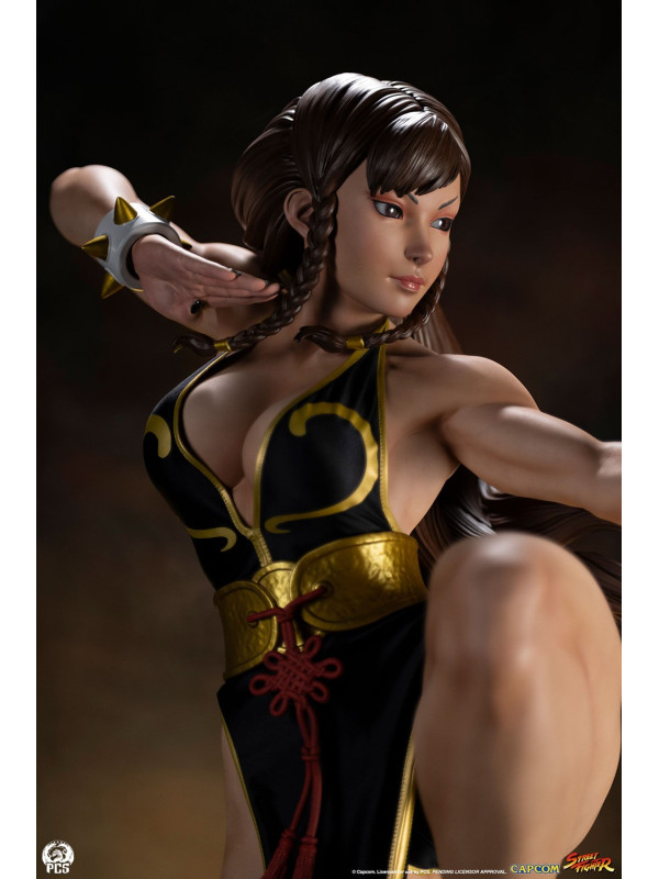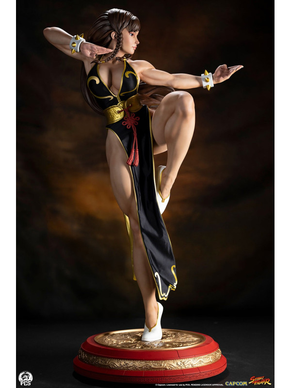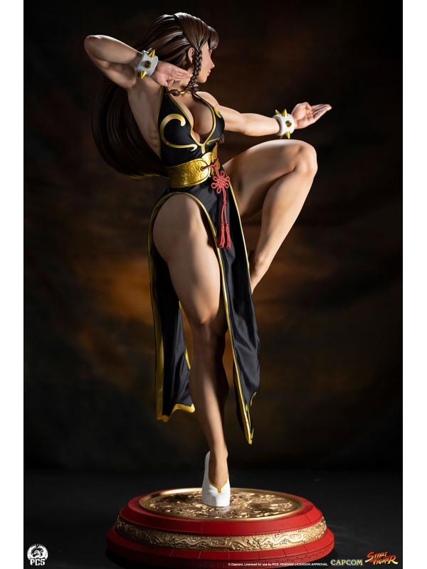 Con más de 91 cm de altura, Chun-Li está lista para la acción, balanceándose con gracia sobre un pie, lista para dar su temible patada huracanada. Luciendo el elegante vestido negro de su look alternativo de "Batalla", esta prenda de hermosa confección está decorada con ribetes dorados y le llega casi hasta los pies. Su cabello, generalmente recogido con sus característicos cuernos de buey, lo lleva suelto con una pequeña trenza sobre cada oreja. Un par de brazaletes blancos con pinchos y un cinturón dorado martillado sujeto con un nudo ornamentado, y unas discretas bailarinas blancas completan su look de noche.