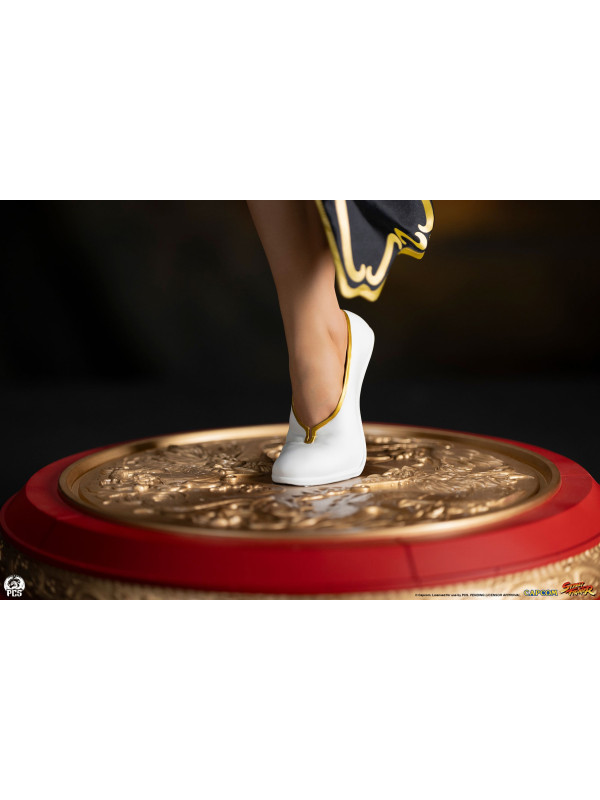 Chun-Li posa sobre una base de disco de perfil bajo decorada en rojo y dorado con detalles esculpidos inspirados en el cinturón bordado que usó en su primera aparición en Street Fighter II.