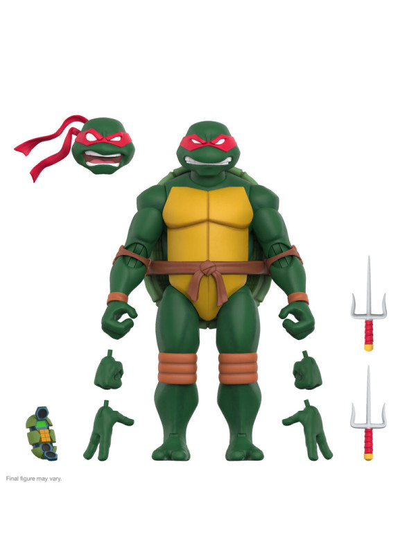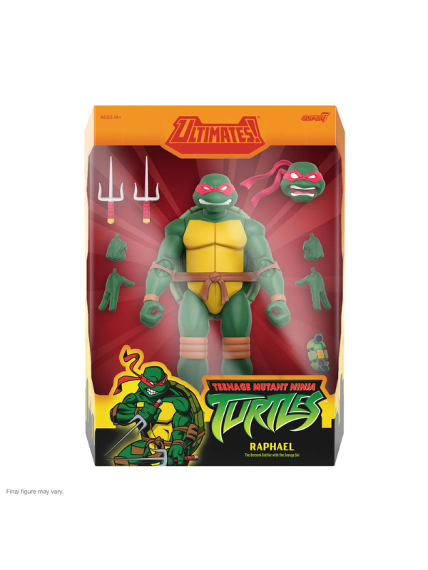 Aunque su temperamento y terquedad a menudo lo meten en problemas, Raphael siempre está listo para hacer lo que sea necesario para ayudar a sus hermanos. Este Raphael de las Tortugas Ninja Adolescentes Mutantes ULTIMATES!, altamente articulado y a escala de 7", está inspirado en su aparición en la serie animada de 2003 y presenta un esculpido intrincado, detalles de pintura de primera calidad, cabezas y manos intercambiables y una variedad de accesorios para combatir el crimen, incluyendo un par de Sais y una Shell Cell. Además, por primera vez, brazos y rodillas con doble articulación para una mayor flexibilidad. ¡Este Raphael de las Tortugas Ninja Adolescentes Mutantes ULTIMATES! puede ayudar a transformar tu colección de las Tortugas Ninja, ¡sin necesidad de Mutagen Ooze!