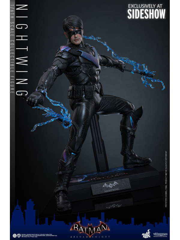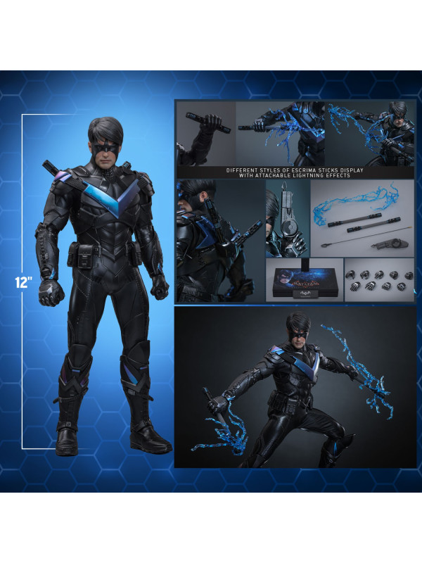 Como continuación de la aclamada colección Batman: Arkham Knight , nos complace presentar la figura coleccionable a escala 1/6 de Nightwing . Esta exclusiva figura de acción está limitada a 2000 unidades, disponible solo a través de Sideshow, y se pueden reservar en pequeñas cantidades en tiendas oficiales de Hot Toys seleccionadas. Diseñada con maestría basándose en la apariencia de Nightwing en el juego, la figura de acción de DC Comics presenta una cabeza enmascarada de nuevo diseño con un peinado negro meticulosamente esculpido. Su traje se recrea fielmente con un traje negro de nueva confección, detallado con piezas de armadura azul metalizado, un cinturón multiusos con bolsillos y botas negras.