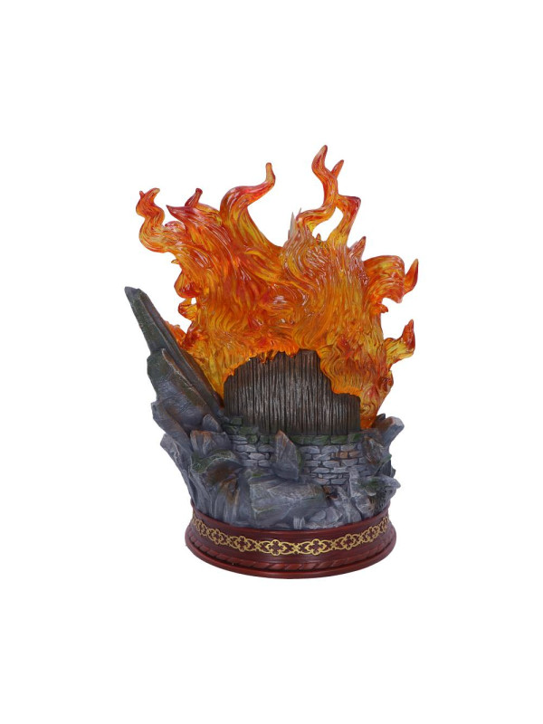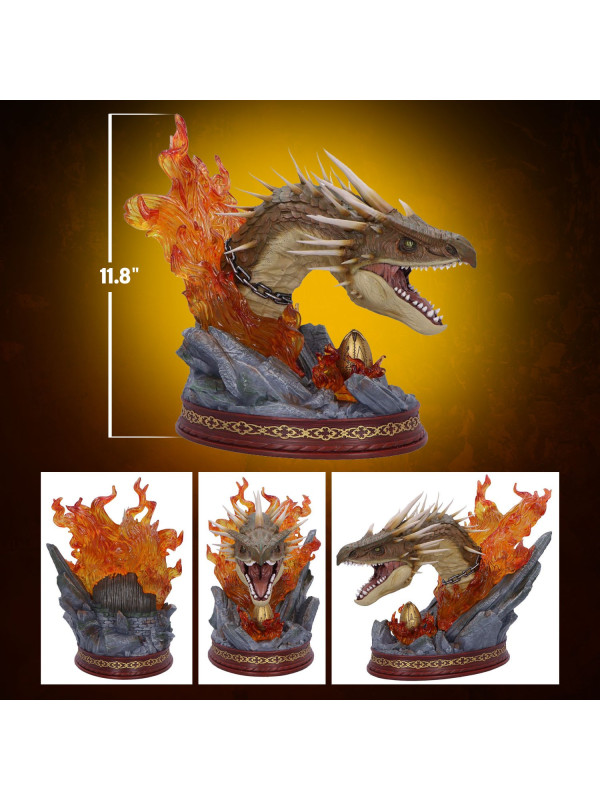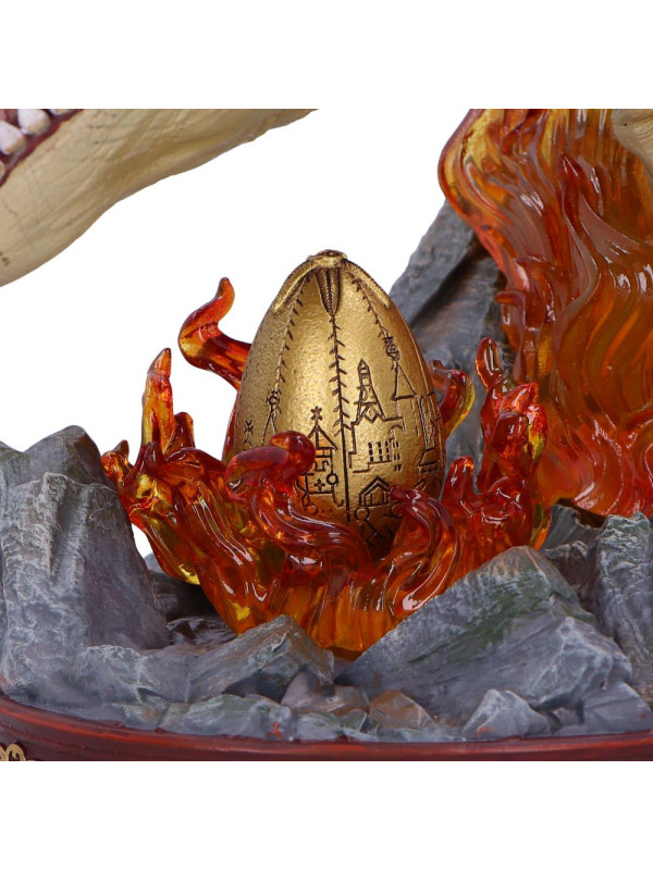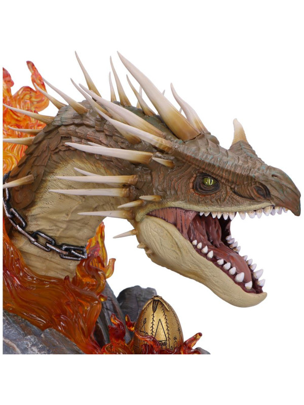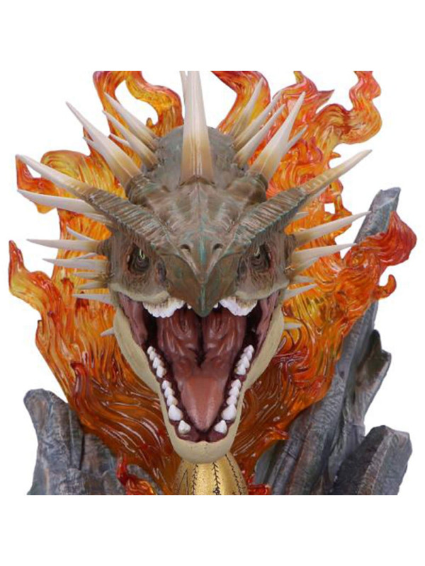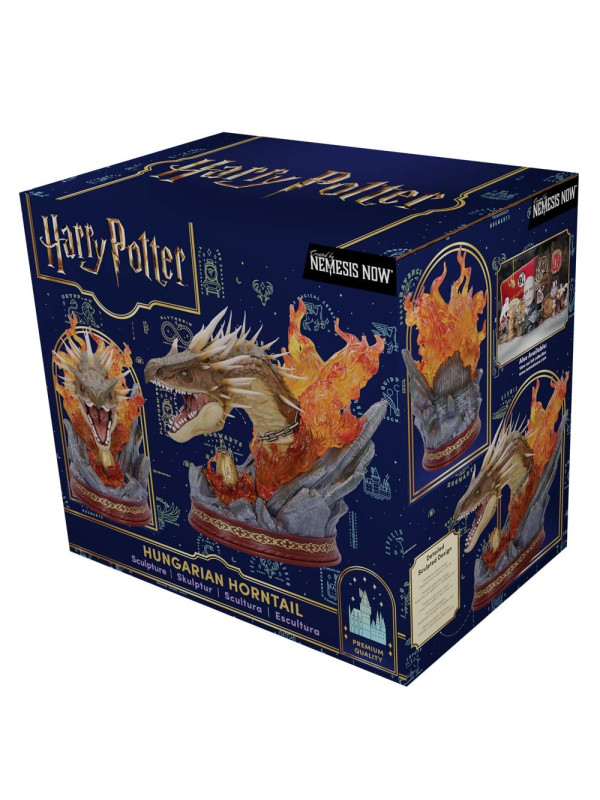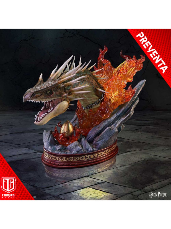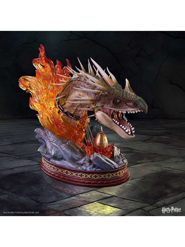 El busto presenta una impactante escultura de la cabeza del Colacuerno Húngaro, rodeada de llamas naranjas translúcidas que evocan la ferocidad de la criatura. La base rocosa aporta textura y peso al diseño, mientras que el huevo dorado, situado bajo la mirada atenta del dragón, conecta la pieza directamente con la icónica escena de Harry Potter y el cáliz de fuego .