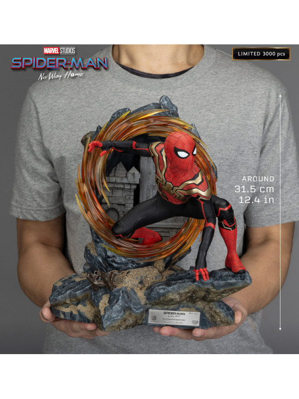 El traje integrado de Tom Holland combina las características del traje de Iron Spider con las del traje tradicional. La estatua se basa en una escena en la que viaja a través de un anillo de poder dorado, recreando una escena icónica y atemporal. La vibrante combinación de rojo, negro y dorado, complementada con pintura metálica y efectos de energía, muestra el poder y la responsabilidad de esta nueva generación de Spider-Man.