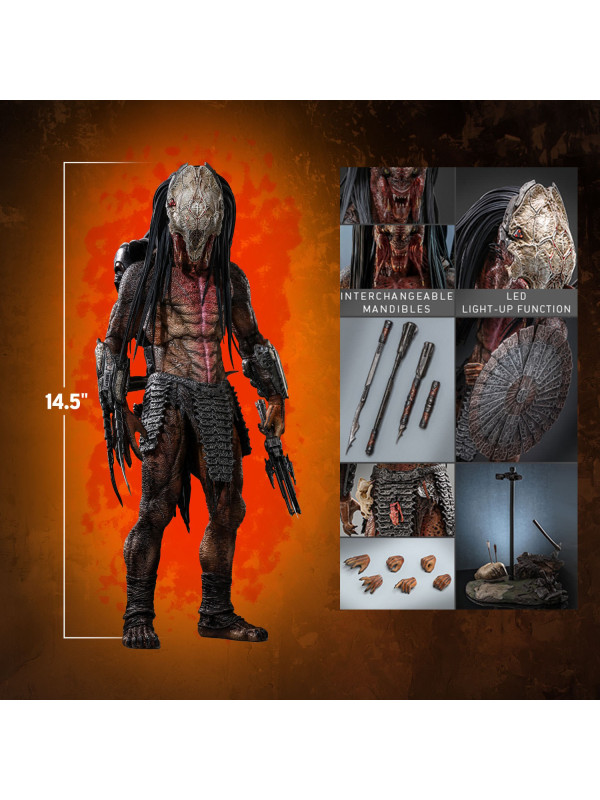 Exquisitamente elaborada a partir de la apariencia de Feral Predator en Prey, con una pintura excepcional, esta figura de acción a escala 1/6 presenta una cabeza esculpida de nuevo diseño con pelo de goma muy detallado, mandíbulas intercambiables con colmillos, falda laminar esculpida y tobilleras. Incluye una variedad de armas de caza como escudo, cuchillas, látigo, bastones con diferentes modos, fusil submarino y lanza, y accesorios como una máscara de Predator con iluminación LED, una mochila cápsula, huesos y una base de diorama de nuevo diseño inspirada en el campamento de Naru para una amplia exhibición.