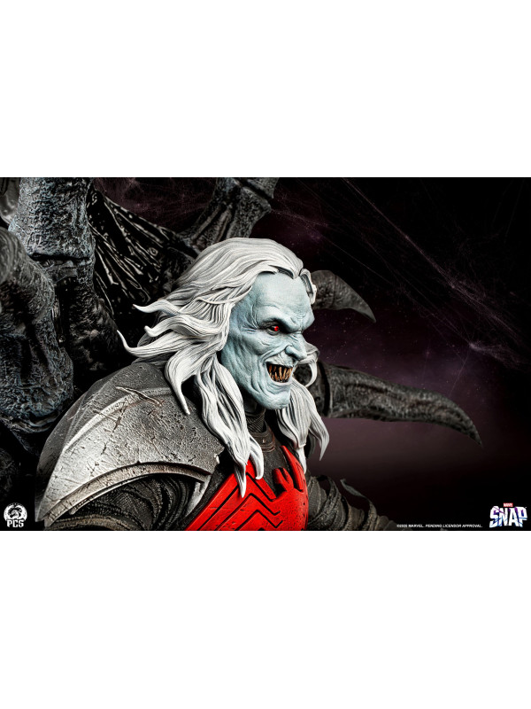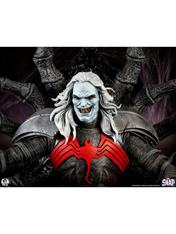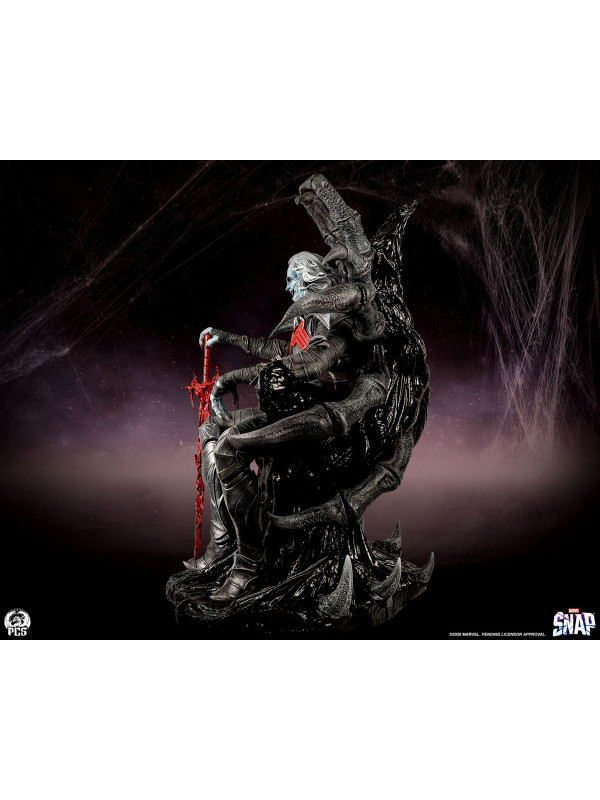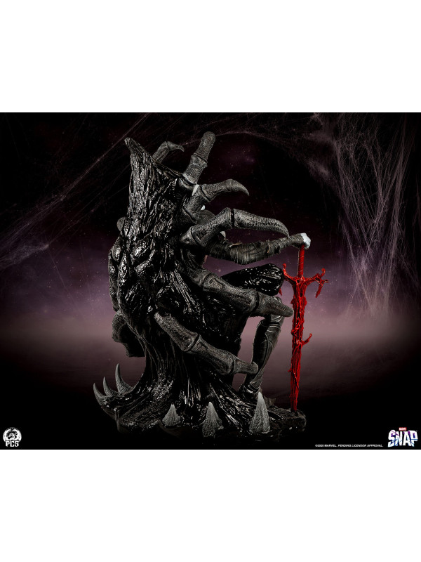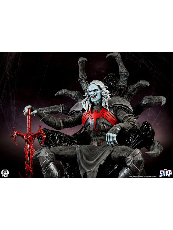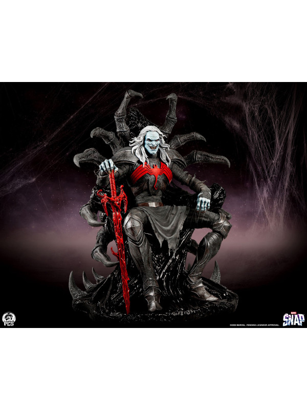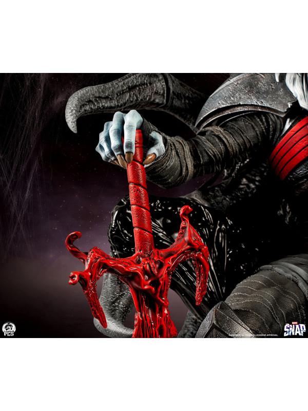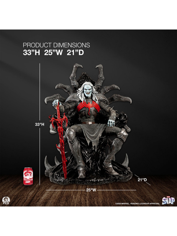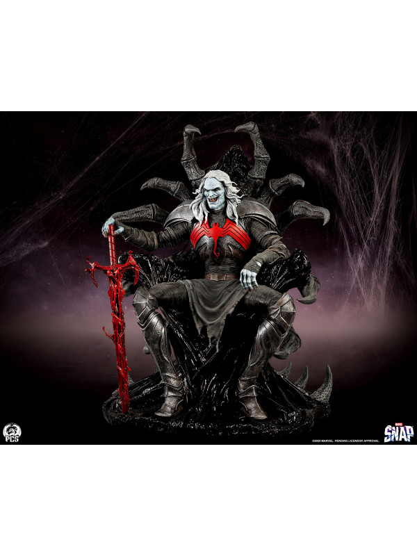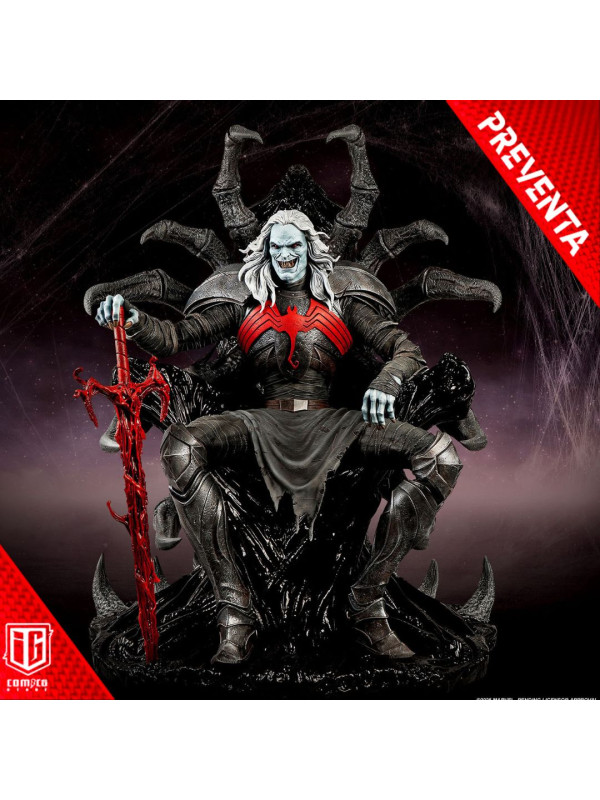 Esta estatua, completamente esculpida, mide unos impresionantes 84 cm de altura y representa a la deidad interestelar sentado con seguridad en su trono, con su vigorosa espada simbionte roja a su lado. Knull viste una armadura oscura con una vibrante araña roja en el pectoral. Sus brazos y piernas están envueltos en correas de tela deshilachadas, esculpidas con asombroso detalle. Su trono posee la textura suave y cristalina del simbionte en estado líquido. De su monstruoso asiento sobresalen enormes patas de araña de aspecto antiguo que casi abrazan al Rey de Negro.