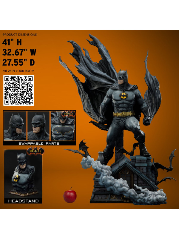 Con una imponente altura de 104 cm, Batman vigila su ciudad desde lo alto de un precipicio gótico, rodeado de sus compañeros nocturnos. Como el oscuro guardián de Gotham City, Batman ha cobrado vida gracias a la pasión de los artistas de Prime 1 Studio: su físico esculpido, propio de un justiciero, ha sido magistralmente interpretado; ondeando al viento vespertino, su capa luce una distintiva textura de cuero, y Batman se yergue sobre una base elaboradamente detallada que rinde homenaje a la estética de Gotham, con vapor que se eleva en el aire nocturno.