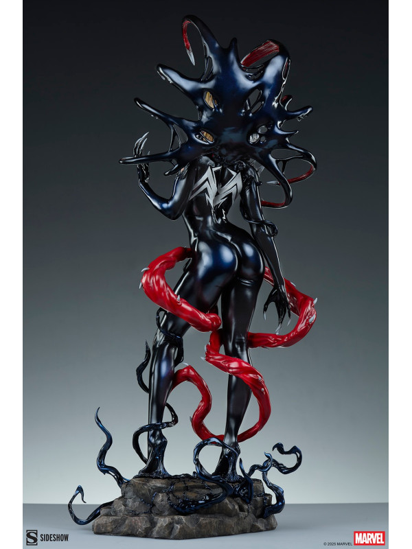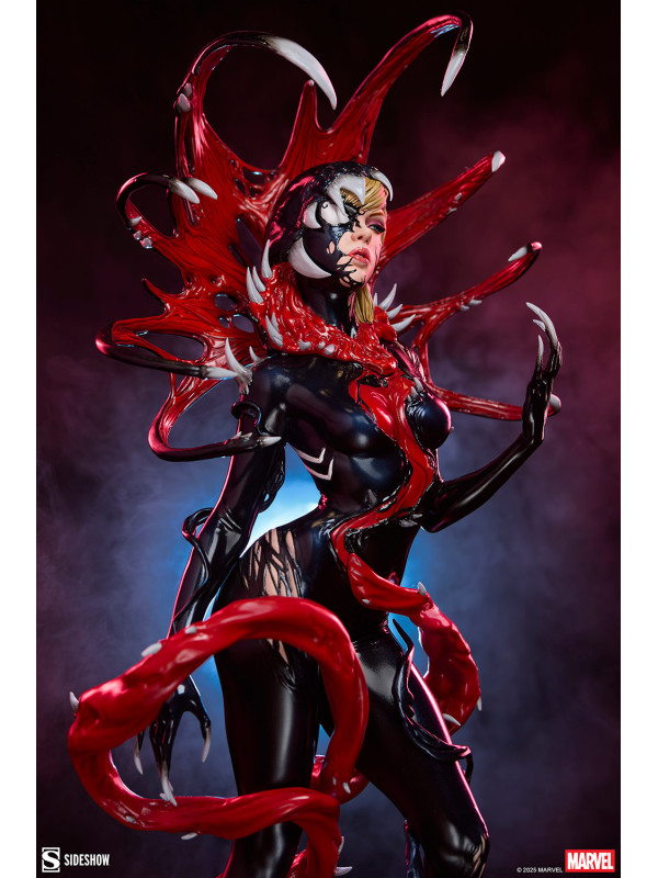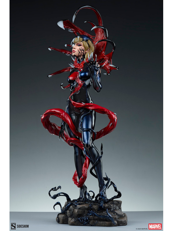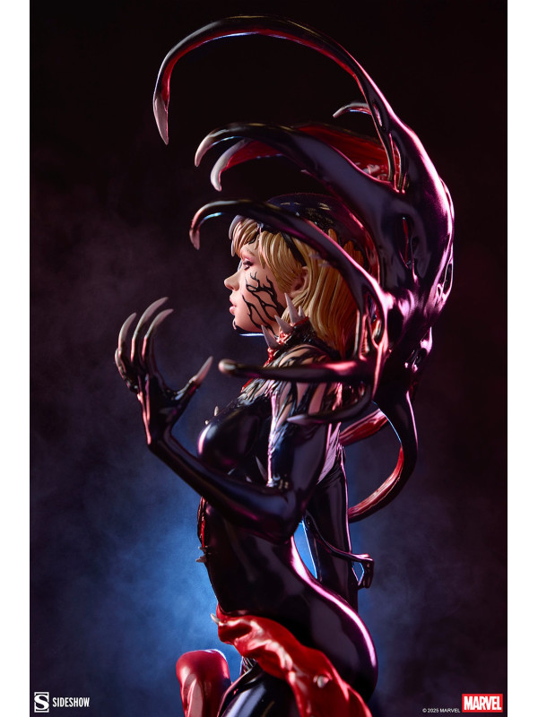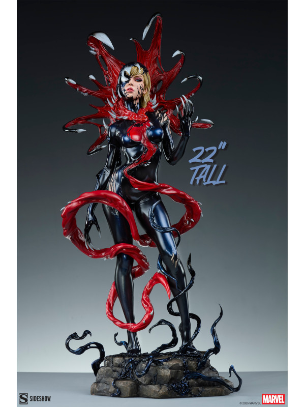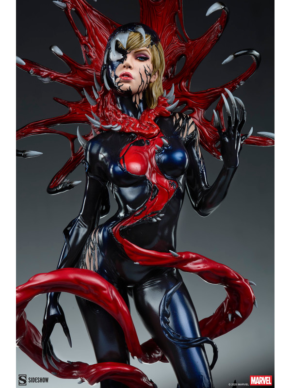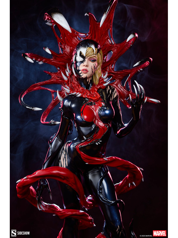 ¡Es una toma de control... y una transformación! La figura Gwenom Premium Format™ mide 55,8 cm de alto, 26,2 cm de ancho y 20,3 cm de profundidad, creando una impactante yuxtaposición entre la violencia y la vulnerabilidad de Gwen Stacy. Está corrompida, pero a la vez empoderada, ya que el simbionte líquido se fusiona con sus sentimientos... y su sentido de la moda. Su capucha luce colmillos salivantes como una Venus atrapamoscas gigante, mientras que el viscoso simbionte crea un traje ajustado y tacones para su huésped. La identidad de Gwenom se ha deformado por completo a través de una lente venenosa, y se la puede ver sonriendo con sorna incluso mientras una ira alienígena la consume.