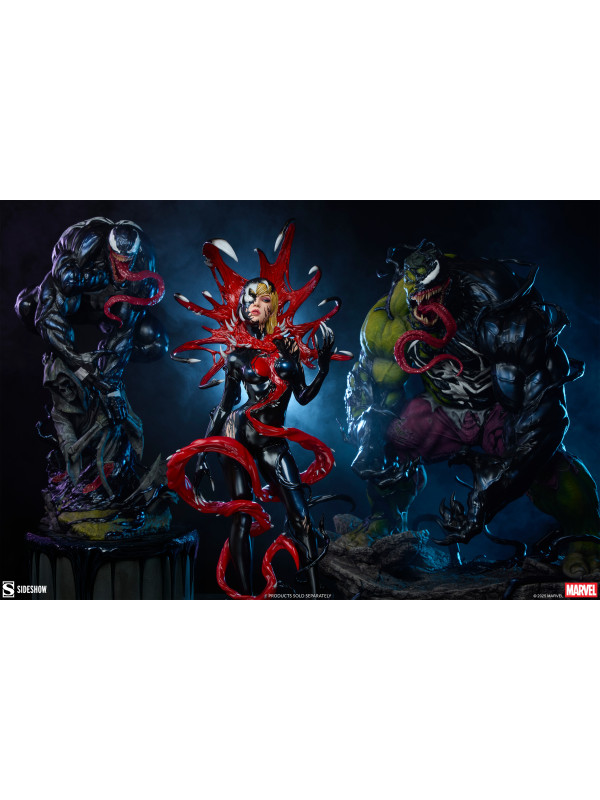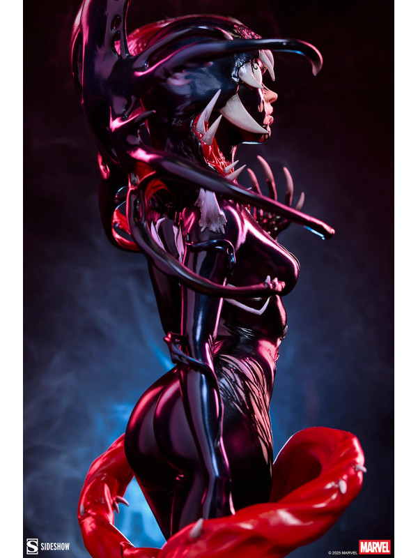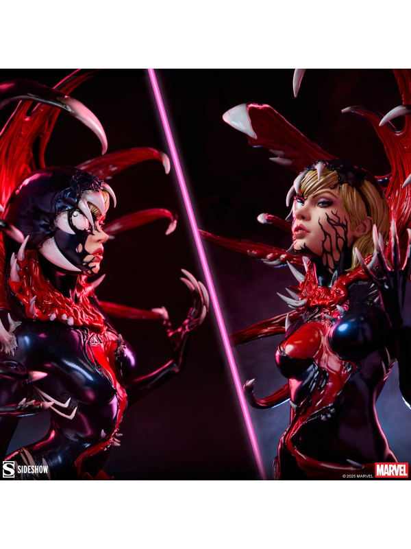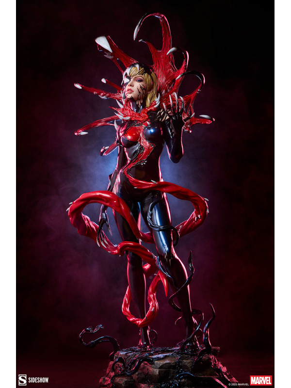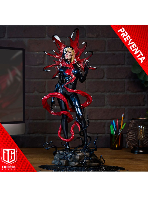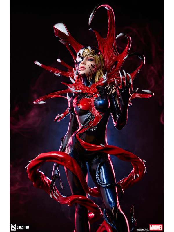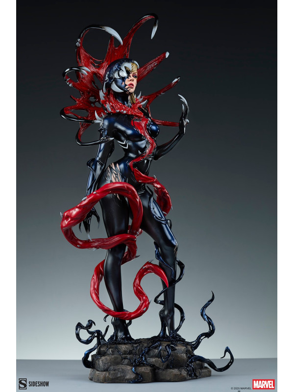 ¡Es una toma de control... y una transformación! La figura Gwenom Premium Format™ mide 55,8 cm de alto, 26,2 cm de ancho y 20,3 cm de profundidad, creando una impactante yuxtaposición entre la violencia y la vulnerabilidad de Gwen Stacy. Está corrompida, pero a la vez empoderada, ya que el simbionte líquido se fusiona con sus sentimientos... y su sentido de la moda. Su capucha luce colmillos salivantes como una Venus atrapamoscas gigante, mientras que el viscoso simbionte crea un traje ajustado y tacones para su huésped. La identidad de Gwenom se ha deformado por completo a través de una lente venenosa, y se la puede ver sonriendo con sorna incluso mientras una ira alienígena la consume.