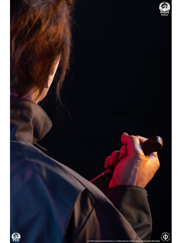La Edición Deluxe presenta un torso completo que permite a Michael sujetar su característico cuchillo, añadiendo un toque aún más terrorífico a esta figura coleccionable de tamaño natural. Esta versión se asienta sobre una sencilla base de estilo museo de aproximadamente 33 cm de ancho y 23 cm de profundidad.