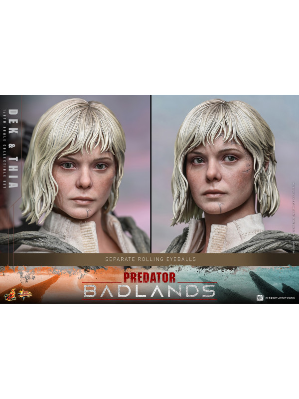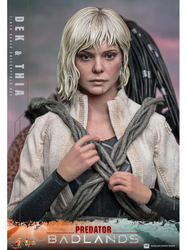 La figura coleccionable de Thia a escala 1/6 presenta un asombroso parecido con la androide de Weyland-Yutani. La figura incluye una cabeza esculpida con dos pares de ojos móviles intercambiables (ojos con iris marrón y ojos blancos con el logotipo de la Corporación Weyland-Yutani), cicatrices faciales detalladas y cabello rubio finamente esculpido. Su traje consta de un mono negro y una chaqueta blanca desgastada, y viene armada con un rifle de pulsos. Thia está diseñada con un medio cuerpo que deja ver los detalles mecánicos y cuenta con conexión magnética, lo que permite a los coleccionistas acoplarla fácilmente a la espalda de Dek con la correa en forma de rama que la mantiene en su lugar, recreando así su colaboración tal como se ve en la película.