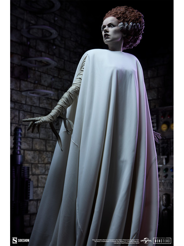 Aunque su aparición en pantalla duró apenas unos minutos, la Novia de Frankenstein se ha inmortalizado en el cine de terror por su impactante apariencia y su agudo grito. Sideshow se enorgullece de ofrecer a los coleccionistas una impresionante nueva figura a escala 1/4 de la Novia, ataviada con un vaporoso vestido blanco con cordones a lo largo de la espalda. Bajo sus vendas, la figura Premium Format Mixed Media™ de la Novia de Frankenstein presenta una escultura de poliresina con todo lujo de detalles que reproduce su cuerpo envuelto en vendas. Recién despertada, se yergue sobre el destartalado suelo de madera del laboratorio de Henry Frankenstein.