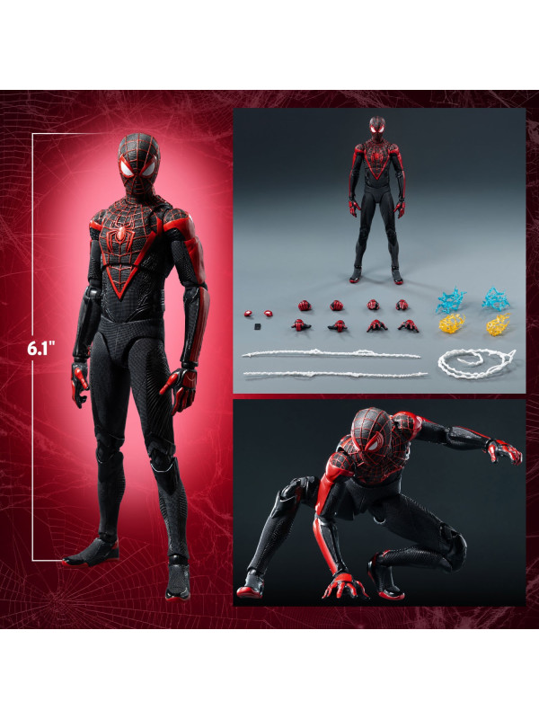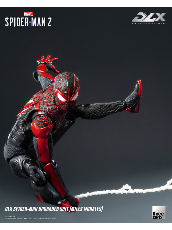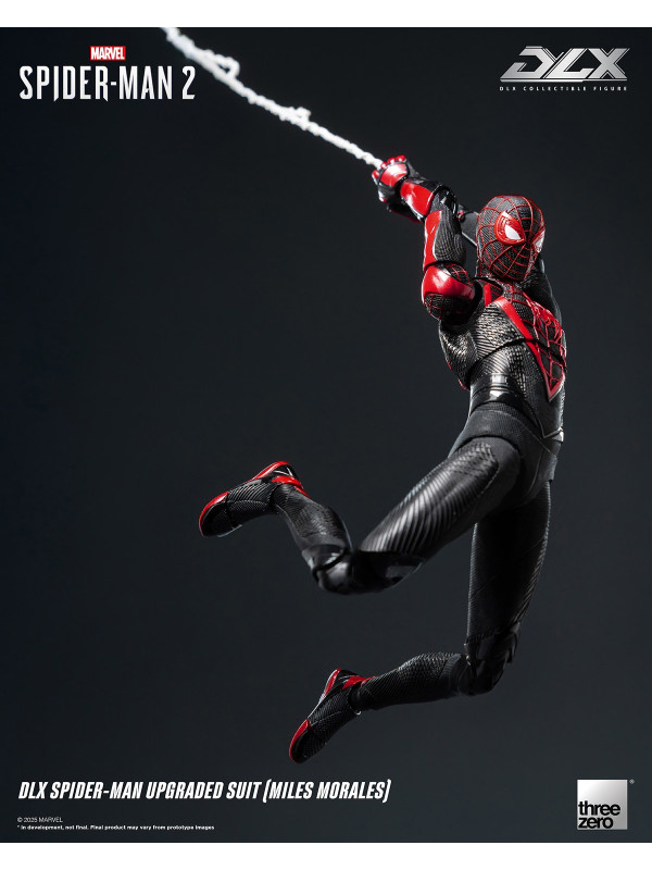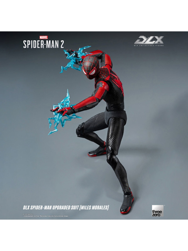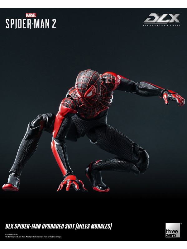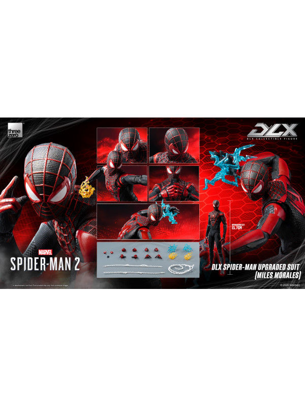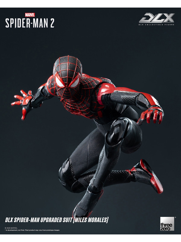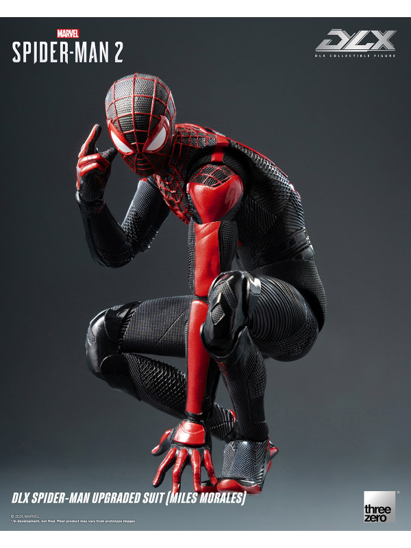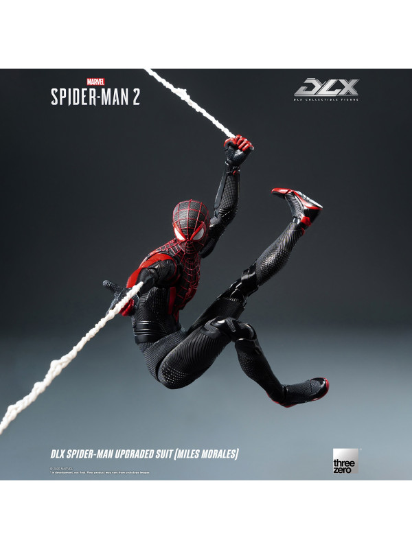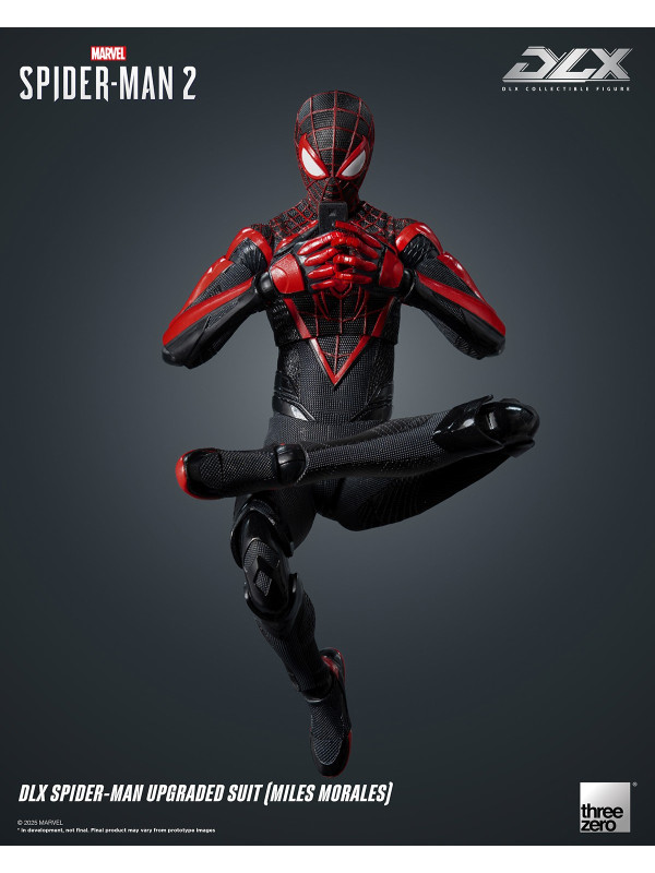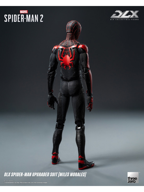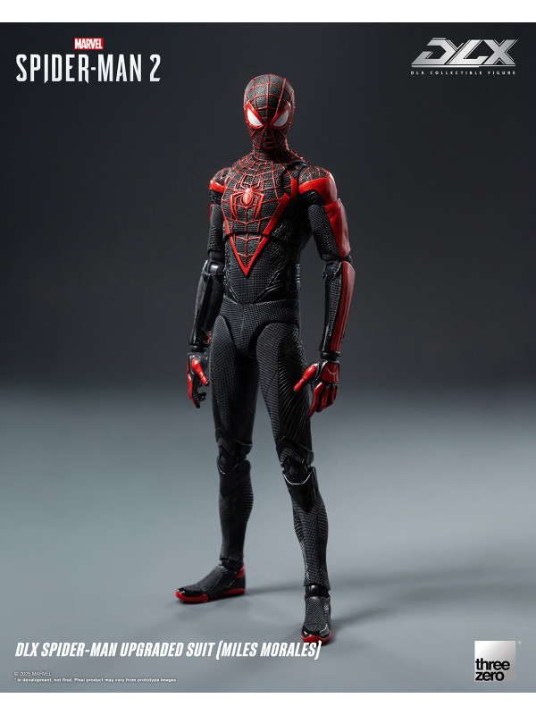 El Traje Mejorado DLX de Spider-Man (Miles Morales) mide aproximadamente 15,7 cm (~6") de alto e incorpora el reconocido sistema de fundición a presión DLX de threezero, con aproximadamente 39 puntos de articulación, lo que le proporciona una excelente adaptabilidad y durabilidad. La figura presenta músculos bien definidos y esculpidos, y un traje ajustado con diversas texturas de tela, que reflejan los ricos detalles del diseño del videojuego. El traje negro está decorado con líneas rojas y un patrón de malla esculpida, y el gran emblema de araña roja en el pecho y la espalda reproduce fielmente su apariencia en Marvel's Spider-Man 2.