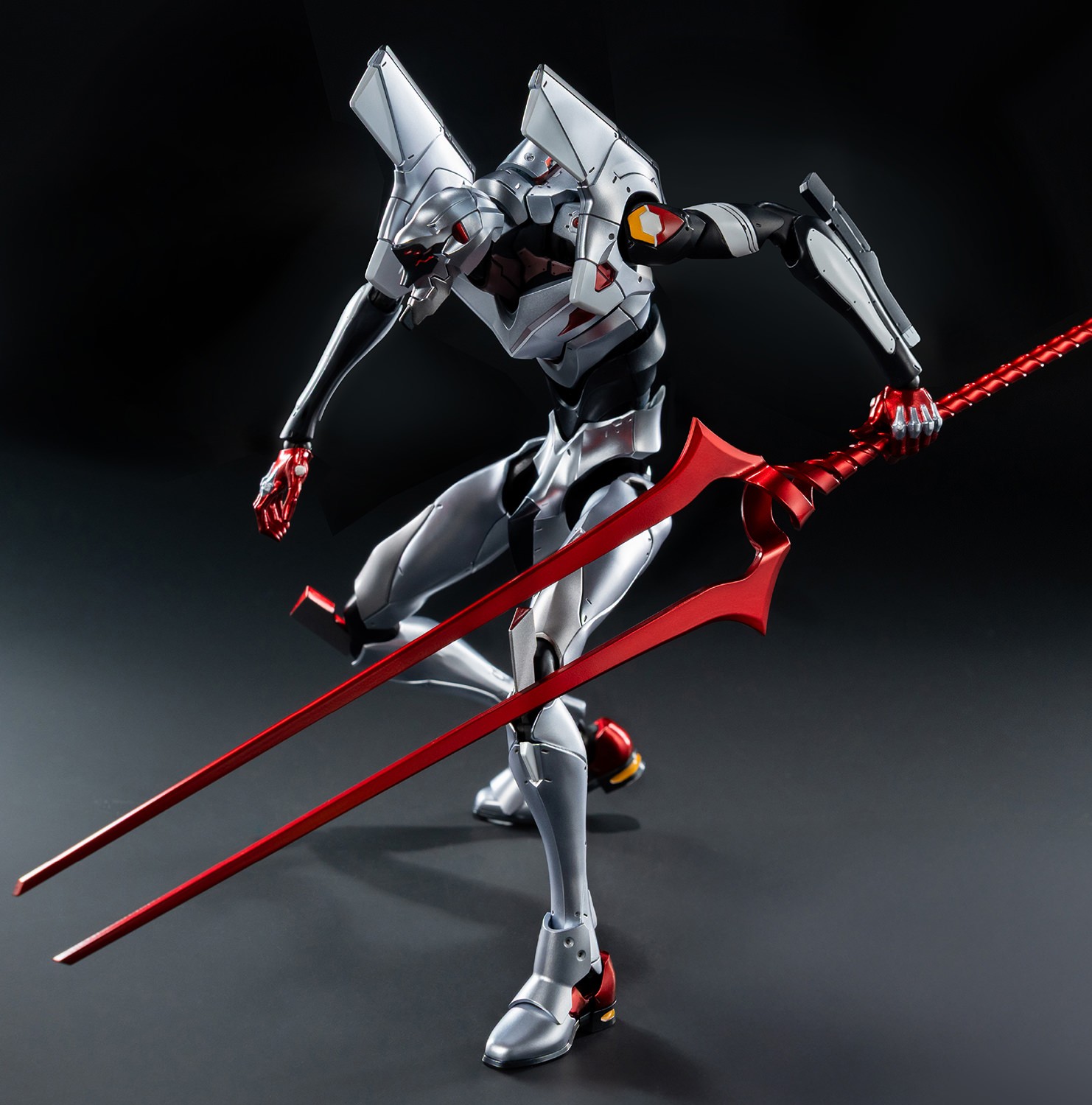 La figura incluye diversos accesorios, incluyendo una Lanza de Longinus pintada en rojo metalizado, a juego con la paleta de colores. También incluye dos Entry Plugs intercambiables, un cuchillo progresivo, un rifle de paletas, un cable umbilical, varios pares de manos intercambiables y un soporte de acción ROBO-DOU para exhibir la figura en poses dinámicas.