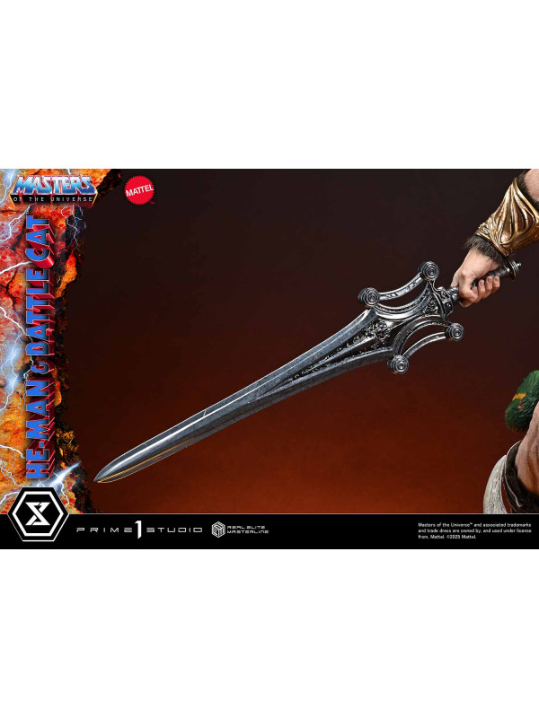 Su cabello salvaje y su impactante retrato, junto con el cuerpo finamente pulido que encarna al "Hombre Más Poderoso del Universo", combinan detalles realistas con una sutil estilización. La enorme Espada de Poder, su arnés de batalla, la hombrera y el taparrabos con detalles de piel están elaborados con superficies ricas y táctiles. El