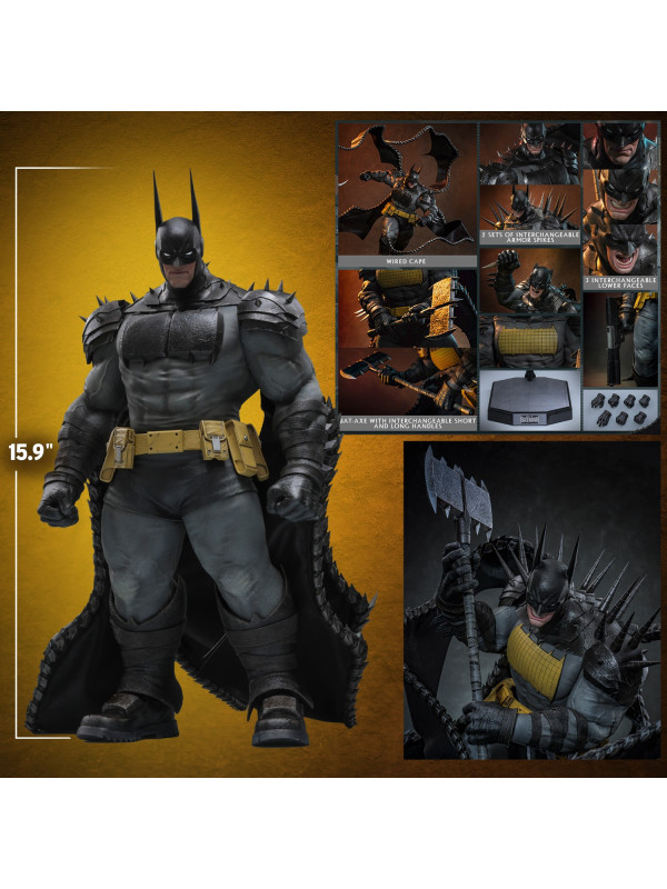 Batman está equipado con un Batitraje con armadura de cuello y hombros diseñada para recrear momentos icónicos. Para personalizar su silueta, el set incluye opciones de púas cortas y largas, lo que permite a los coleccionistas elegir entre un aspecto más limpio o intensificar su agresividad al máximo. El símbolo de murciélago en su pecho se puede quitar magnéticamente; junto con el arma Bat-Hacha, permite a los coleccionistas recrear escenas donde el símbolo de murciélago se convierte en parte de su brutal arsenal. Para completar su imponente perfil, una capa con alambre incrustado en modo alas de murciélago, perfecta para poses dinámicas. Su look se completa con un cinturón amarillo de herramientas y botas largas. Para configuraciones listas para el combate, Batman viene equipado con un Bat-Hacha con mangos cortos y largos intercambiables, así como una escopeta.