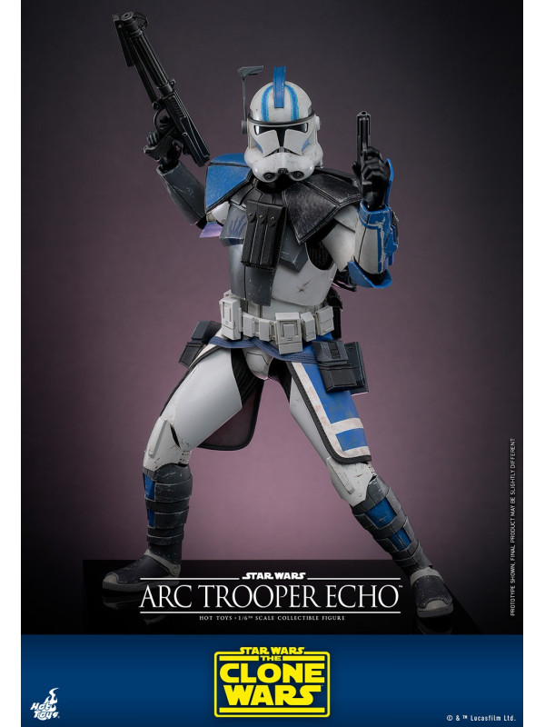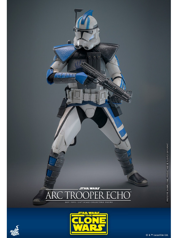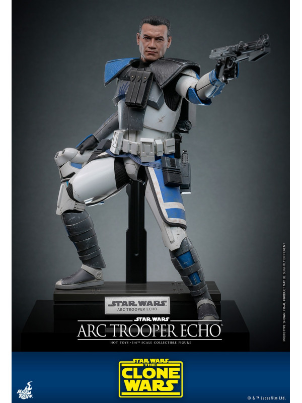 Esta figura de acción de Star Wars altamente detallada está especialmente diseñada en base a la apariencia de Echo en la armadura Clone Trooper Phase II, presenta una escultura de cabeza recientemente desarrollada con gran semejanza, casco y armadura finamente elaborados con marcas únicas y efectos de intemperie, atuendo a medida con falda kama y una serie de equipos que incluyen un bláster pesado, un rifle bláster, un par de pistolas bláster, una mochila y una base de exhibición.