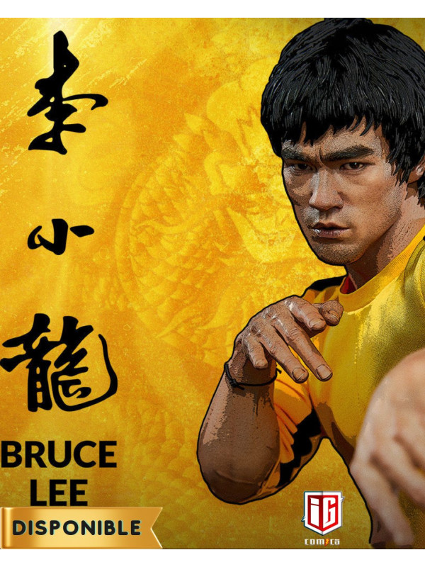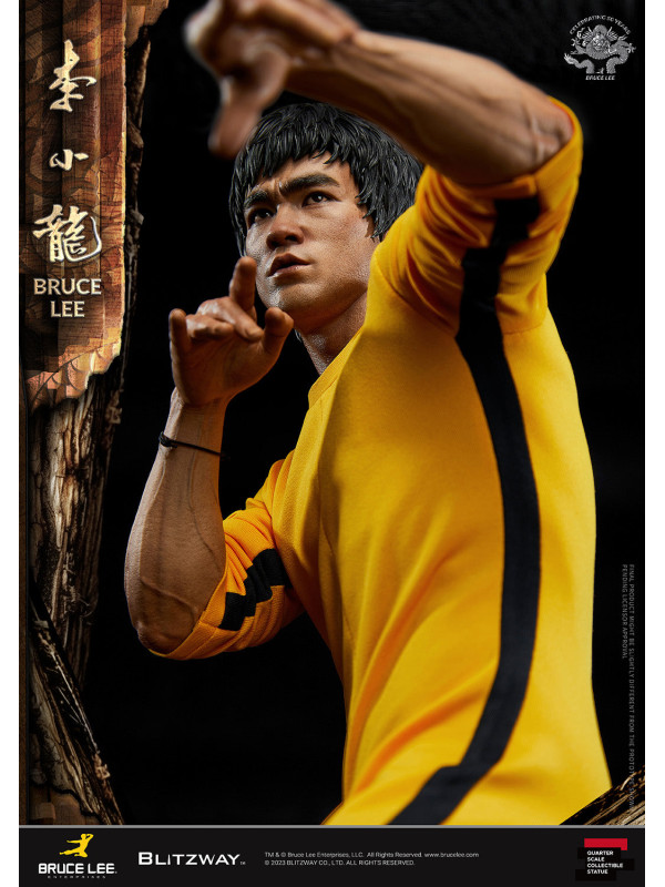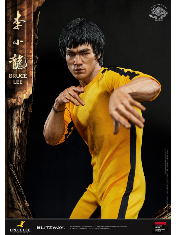 Completa con su característico mono amarillo, la estatua recuerda vívidamente sus escenas de artes marciales, complementadas con detalles intrincados como el accesorio nunchaku y la base.