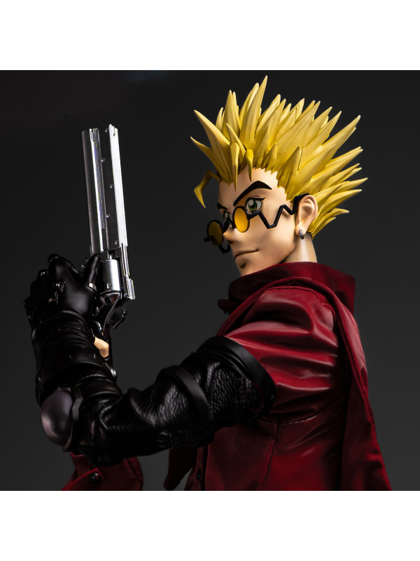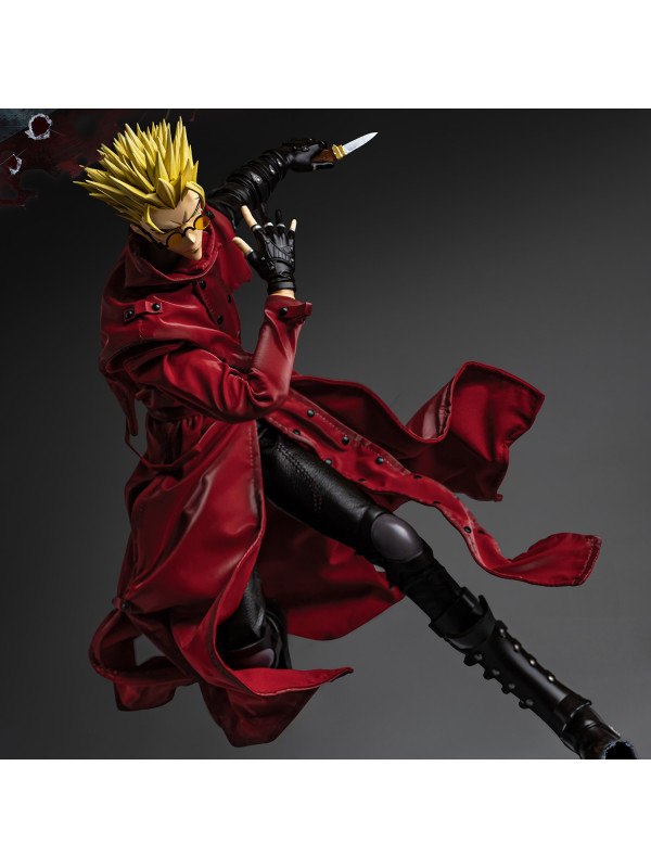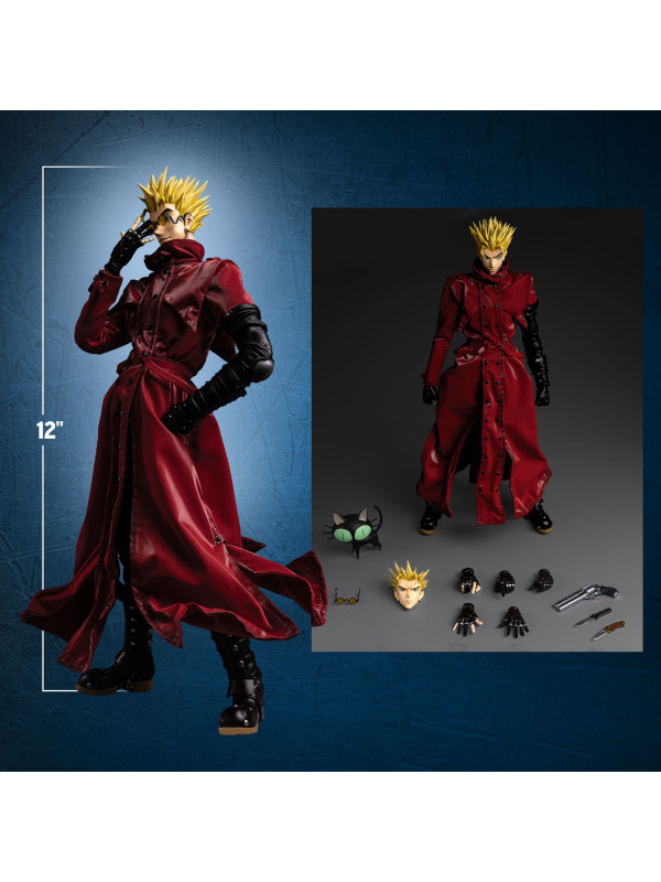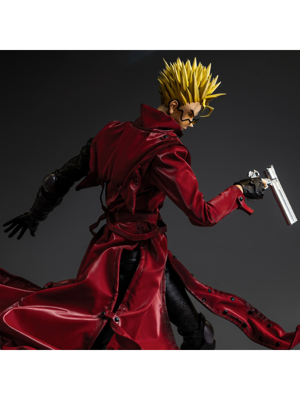 Con una altura aproximada de 31 cm (12"), la figura de acción cuenta con aproximadamente 32 puntos de articulación, lo que permite poses fluidas y dinámicas que capturan el estilo de combate salvaje de Vash. Su distintiva gabardina roja está confeccionada con un material superfino, flexible y duradero, con una confección especializada que reproduce las texturas arrugadas y el ligero desgaste por el uso prolongado en Tierra de Nadie. El cableado integrado en su abrigo facilita la pose, mientras que la superficie tiene un brillo similar al cuero que aumenta la resistencia del material. El look se completa con pantalones marrón oscuro, las icónicas correas en el brazo izquierdo y botas marrón oscuro, meticulosamente detalladas para una fiel reproducción del diseño del personaje.