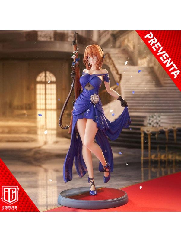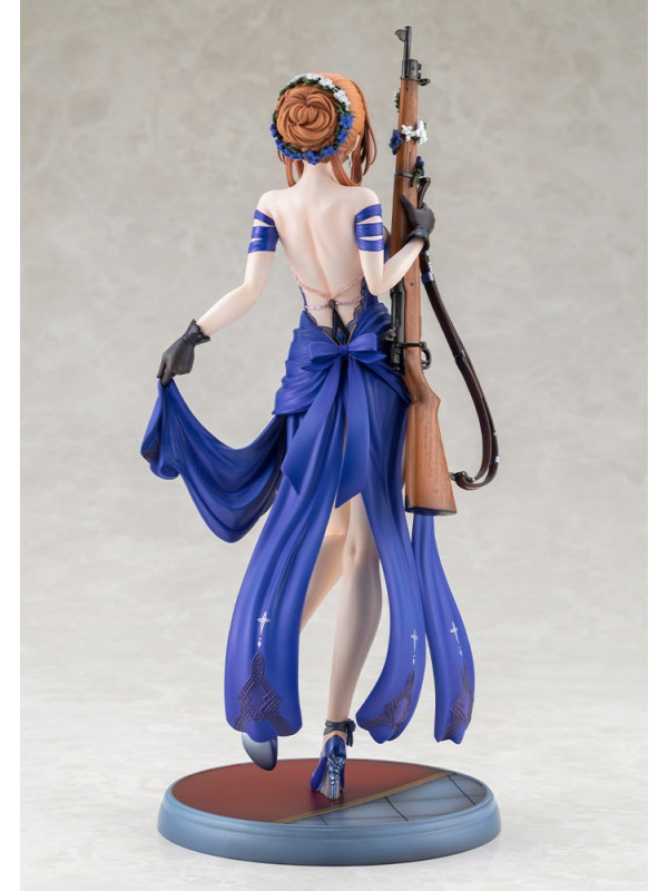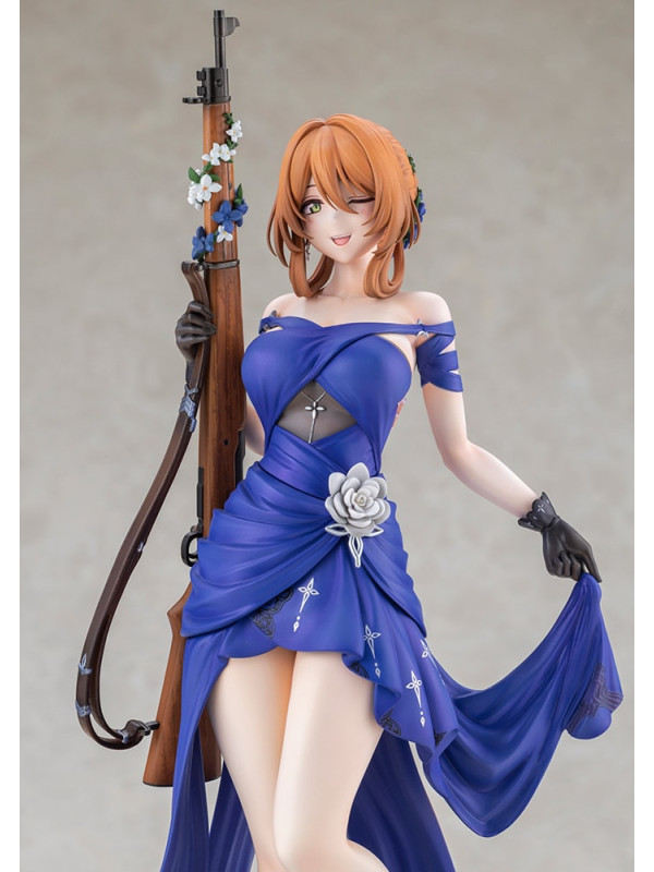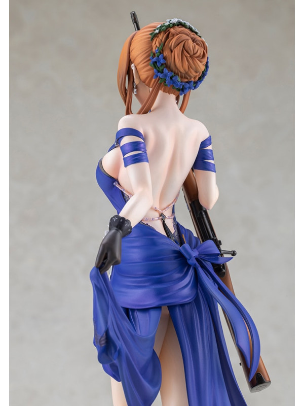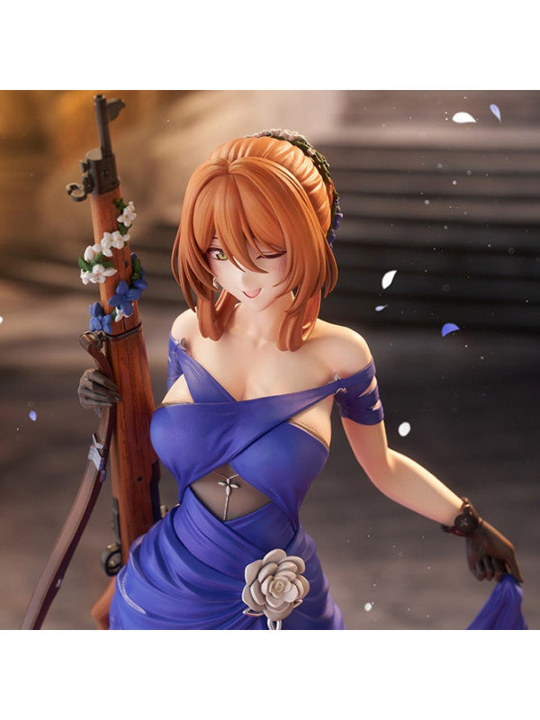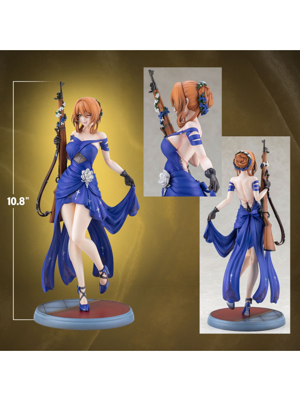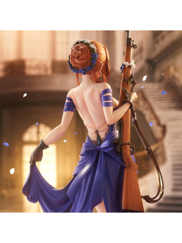 El vestido azul intenso está rematado con pliegues nítidos y pintura perlada ligeramente tonalizada, lo que le confiere una sensación de lujo. Preste atención a la espalda abierta y a las elegantes líneas de la cintura. El distintivo moño, los delicados adornos florales y las joyas, e incluso las vetas de la madera y los herrajes metálicos del rifle han sido recreados meticulosamente hasta el último detalle.