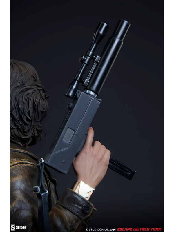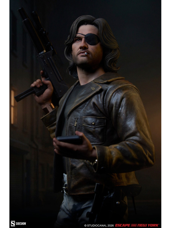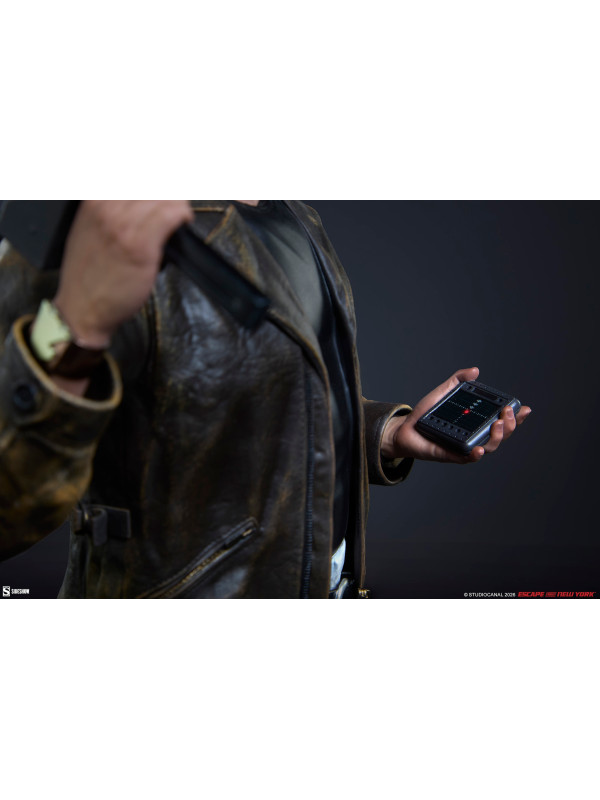 La figura Snake Plissken Premium Format™ está esculpida con una recreación detallada de su estilo ochentero, incluyendo su chaqueta, camiseta negra, pantalones de camuflaje grises y blancos, y botas con punta de clavo. Por supuesto, Snake no se desprevenido: la estatua también incluye su cinturón y fundas para pistolas, un rastreador en la mano izquierda, una subametralladora con silenciador y mira telescópica (con correa de tela suave incluida) en la mano derecha, y el temporizador de cuenta regresiva Life Clock en la muñeca para asegurarse de mantenerse concentrado. Un retrato detallado completa su icónica silueta con un parche en el ojo, un cigarrillo, barba y un peinado mullet, listo para la acción.
