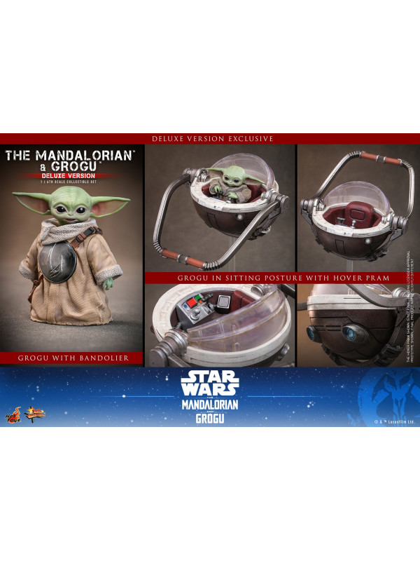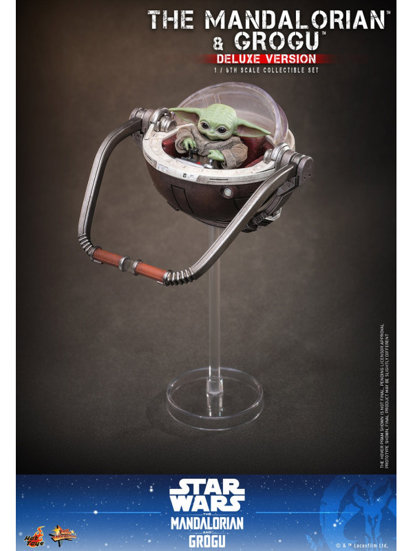 ¡El dúo no estaría completo sin Grogu! La versión Deluxe incluye tres figuras de Grogu a escala 1/6: una de pie con una bandolera que incluye una bolsa y un rondel (exclusiva de la versión Deluxe); otra sentada (exclusiva de la versión Deluxe); y la última, que se acopla magnéticamente al hombro de El Mandaloriano. Todas las figuras tienen cabezas giratorias. Además, la versión Deluxe incluye un carrito flotante de nuevo diseño con asa articulada para que Grogu se siente. Esto la convierte en la pieza de exhibición perfecta para los fans.