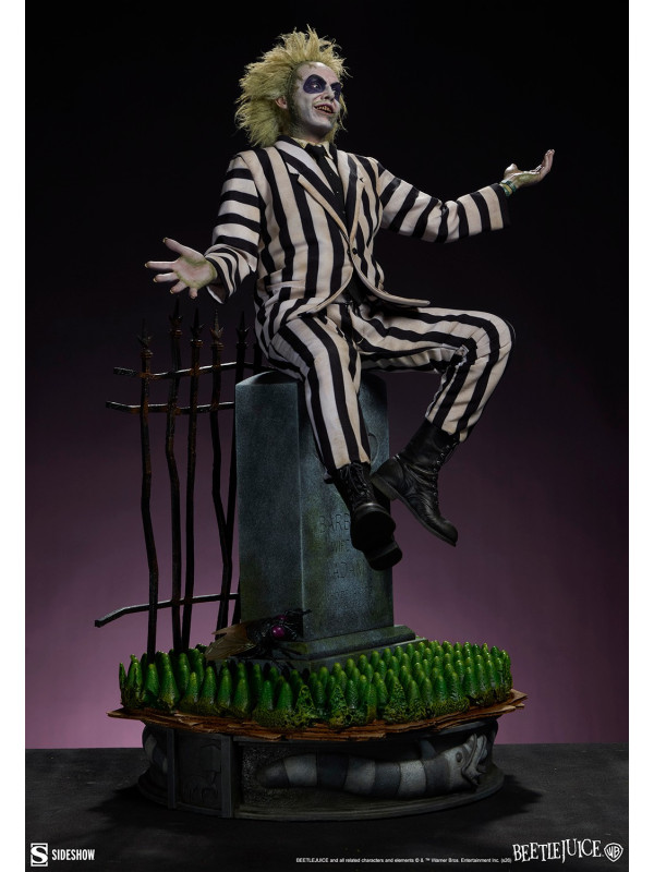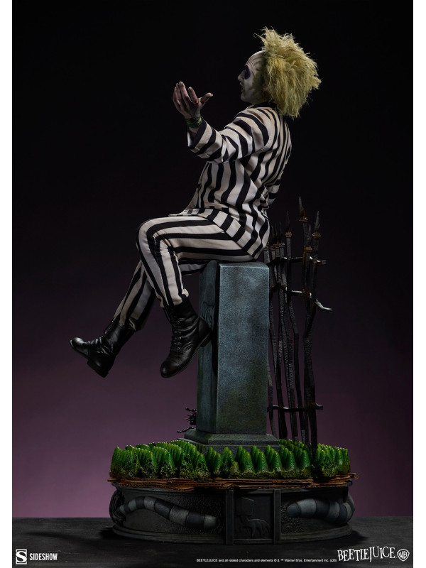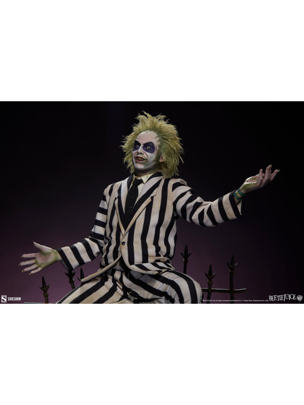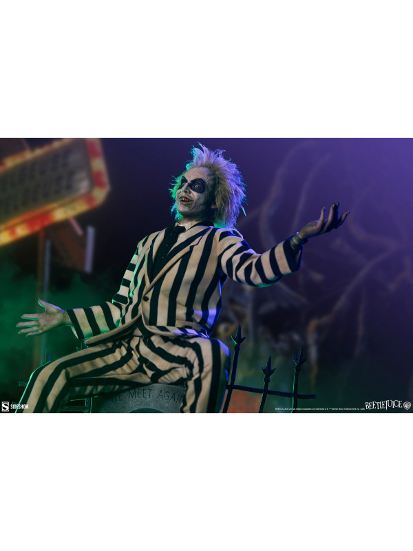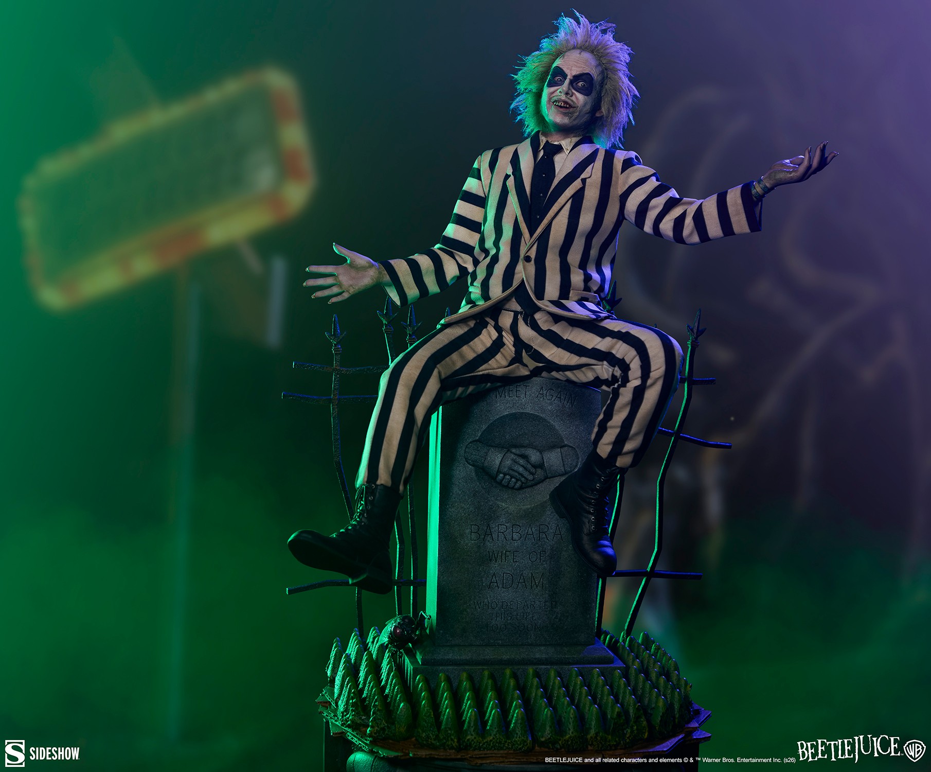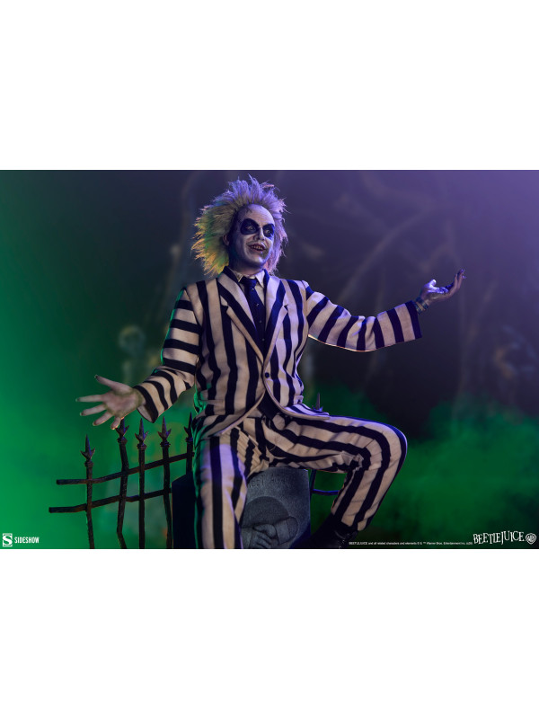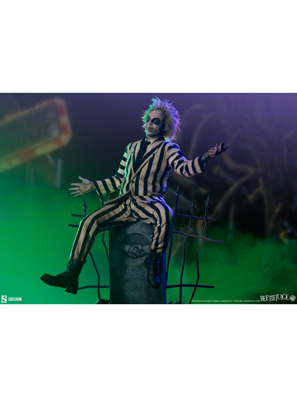 ¡Que empiece el espectáculo! Sideshow subió la intensidad y la figura de Beetlejuice Premium Format Mixed Media™ se desató. Esta pieza de colección de comedia de terror rinde homenaje a la icónica película de 1988 con un vestuario de tela de primera clase, pintura y detalles de escultura.