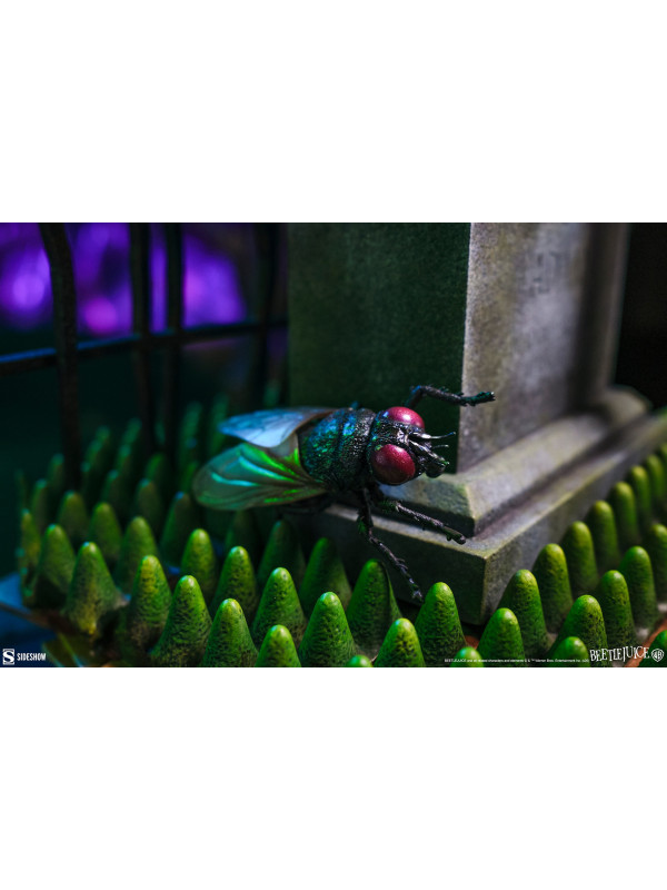 Sentado sobre la tumba de la difunta Barbara Maitland, el Fantasma Más Malvado está listo para armar un buen lío en cuanto alguien pronuncie su nombre tres veces y lo traiga al mundo de los vivos. Beetlejuice sostiene un ejemplar del Manual para los Recién Fallecidos mientras intenta convencer a cualquiera que quiera escucharlo, incluso a una mosca desprevenida.