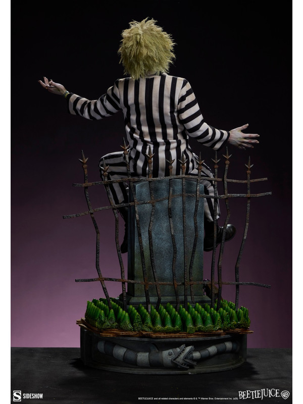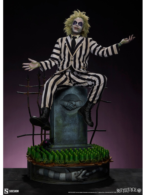 La figura de Beetlejuice Premium Format Mixed Media™ mide 53,8 cm de alto x 37,5 cm de ancho x 32,2 cm de profundidad y cuenta con cabello sintético suave en el rostro del sonriente monstruo, que se puede peinar ligeramente para mantener su aspecto caótico. Su característico traje a rayas blancas y negras, su camiseta blanca y su corbata negra están confeccionados a medida y desgastados para que BJ luzca tan fresco como la tierra bajo las margaritas que los Maitland están cultivando. La figura también incluye una mano izquierda abierta intercambiable por si crees que ese viejo libro polvoriento se parece demasiado a las instrucciones de un equipo de música.